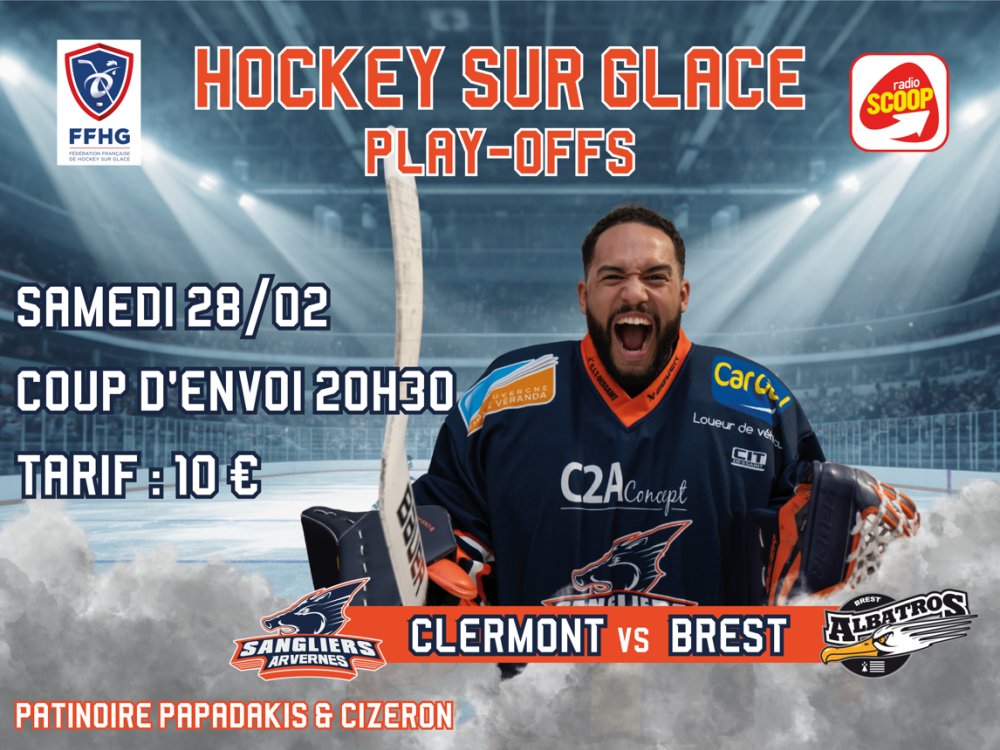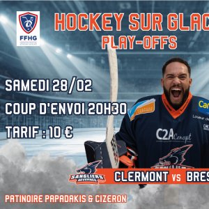 2026-02-28 20:15:00 2026-02-28 23:15:00 Europe/Paris PLAY-OFFS : CLERMONT vs BREST Reservations on : http://hccalessangliers.fr -- Patinoire, Boulevard Gustave Flaubert, Clermont-Ferrand, France Hockey Clermont Communauté Auvergne