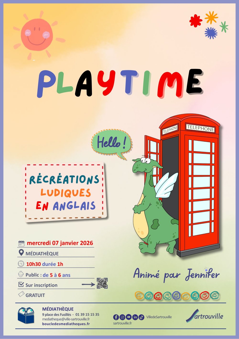 2026-01-07 10:30:00 2026-01-07 11:30:00 Europe/Paris Playtime à la médiathèque Reservations on : https://www.boucledesmediatheques.fr/Sartrouville -- Récréations ludiques en anglais animées par Jennifer.   Pour les enfants de 5 à 6 ans.   Gratuit sur inscription Médiathèque de Sartrouville, Place des Fusillés, Sartrouville, France Médiathèque de Sartrouville