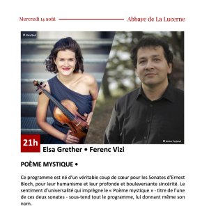 2024-08-14 21:00:002024-08-14 22:30:00Europe/ParisPoème mystique (Elsa Grether, violon - Ferenc Vizi, piano)Reservations on : https://www.billetweb.fr/poeme-mystique-elsa-grether-violon-ferenc-vizi-piano