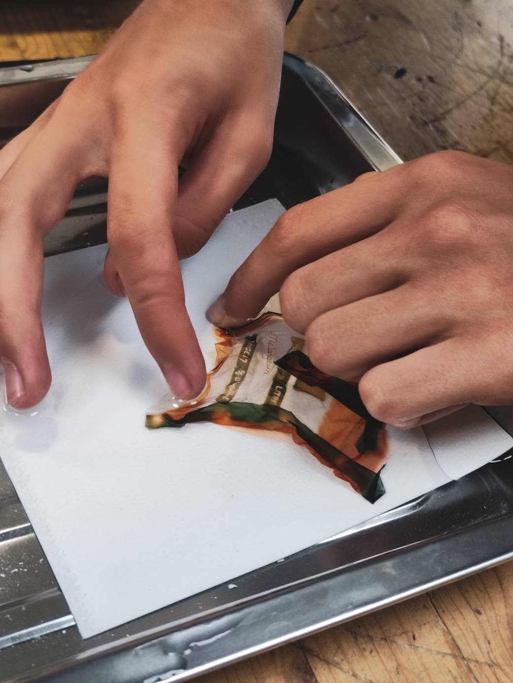 Vous plongerez ensuite dans la partie la plus amusante de cet atelier : Les travaux pratiques ! Vous allez littéralement disséquer votre support d'image jusqu’à la gélatine où se trouve l'image imprimée, pour la transférer sur une feuille aquarelle.