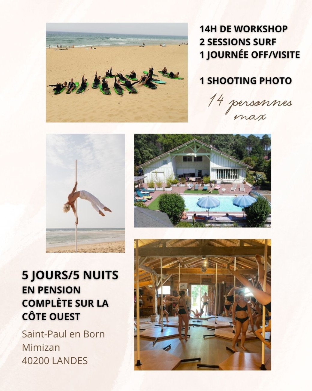 Activités complémentaires : 2 sessions de surf, 1 journée off visite, massages, 1 shooting photo de pole et autres...