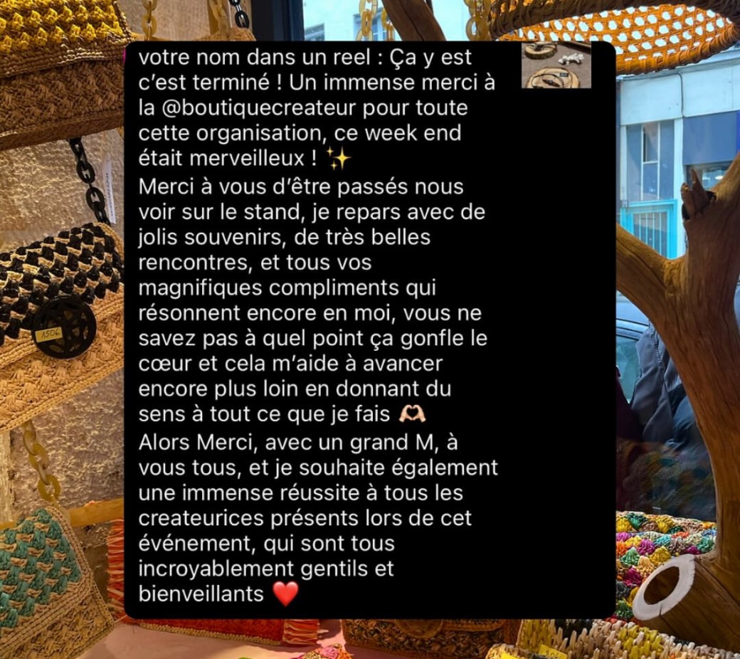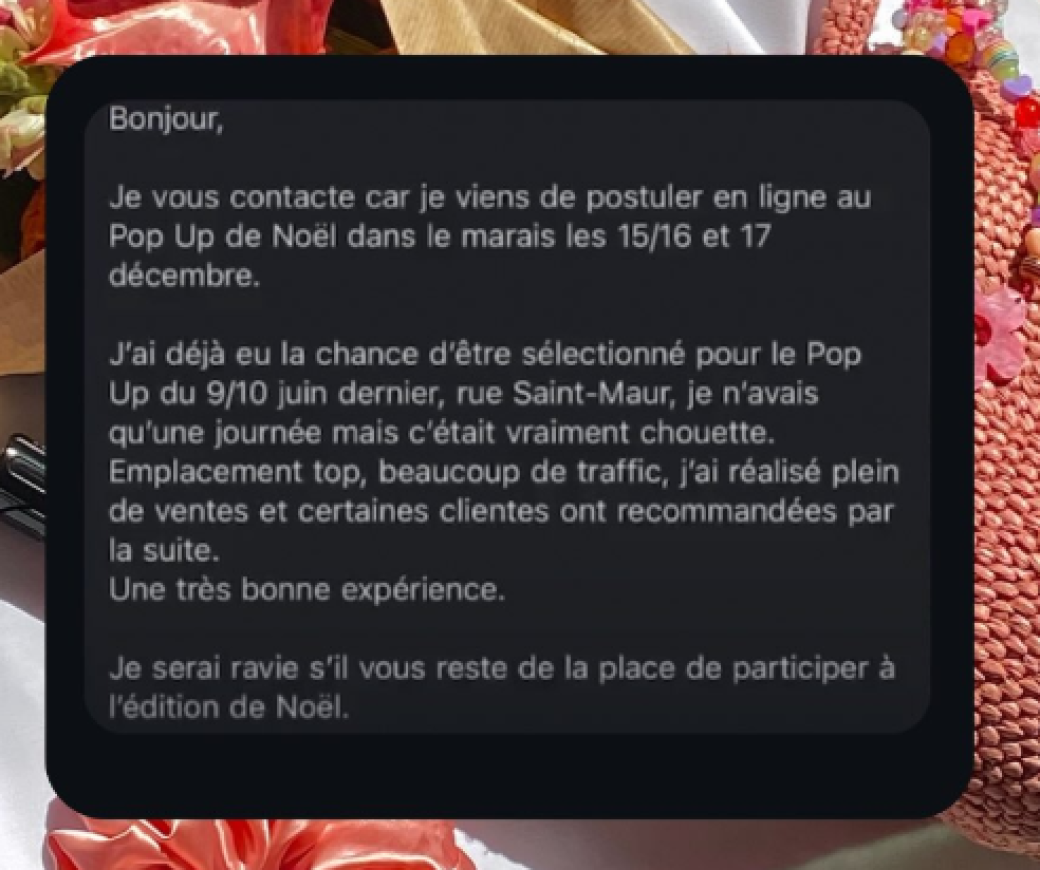Notre public est composé a la fois de Parisiens (habitués des évènements lifestyle, mode ou créateurs) et de touristes Français et internationaux, en quête de découvertes, de pièces uniques et de souvenirs authentiques. Cela garantit une belle diversité de profils et d'acheteurs.