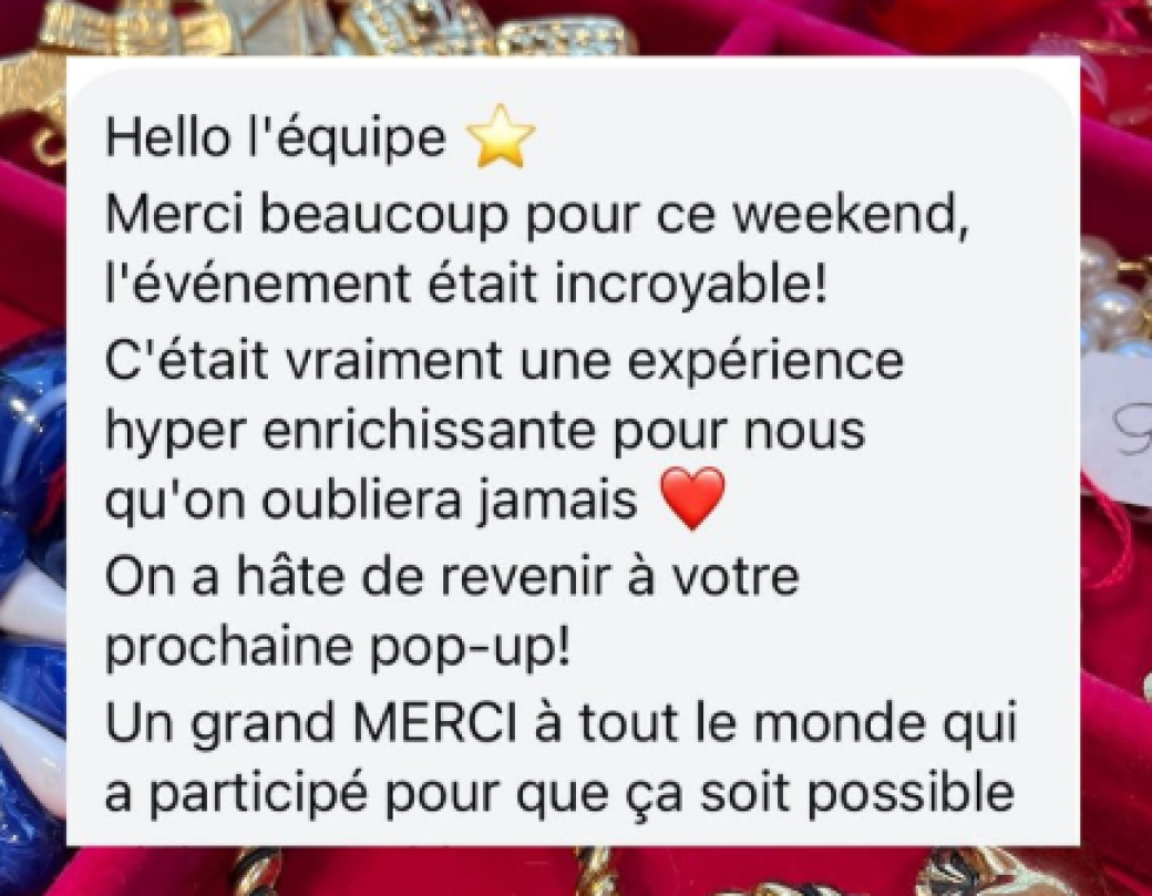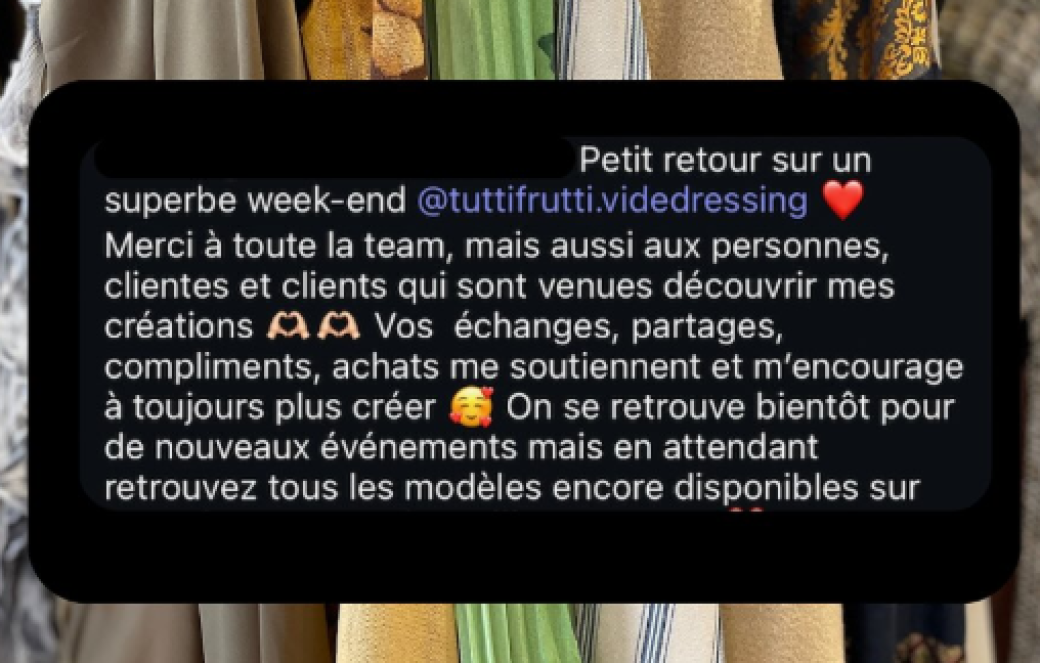 Si un stand n’est plus disponible ou si vous avez des questions, contactez-nous directement sur Instagram (@tuttifrutti.videdressing ou @boutiquecreateur), nous vous aiderons à finaliser votre réservation.