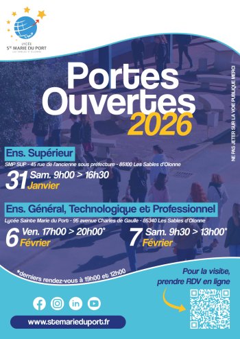 2026-02-06 17:00:002026-02-07 12:00:00Europe/ParisPortes Ouvertes 2026 - Lycée Sainte Marie du PortReservations on : https://www.stemarieduport.fr/