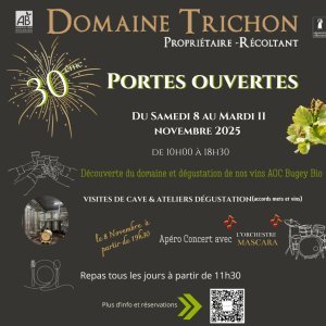 2025-11-08 10:30:00 2025-11-11 18:30:00 Europe/Paris Portes ouvertes Reservations on : https://www.billetweb.fr/portes-ouvertes-domaine-trichon -- Célébrons les 30ans des Portes ouvertes du Domaine. Rendez vous du Samedi 8 au mardi 11 Novembre 2025 pour passer un moment convivial et déguster nos vins et jus de raisins bio mais aussi l'ensemble les excellents produits de nos collègues agriculteurs et producteurs. Domaine Trichon Vins Biologiques, Chem. du LAVOIR, Lhuis, France EARL Domaine TRICHON