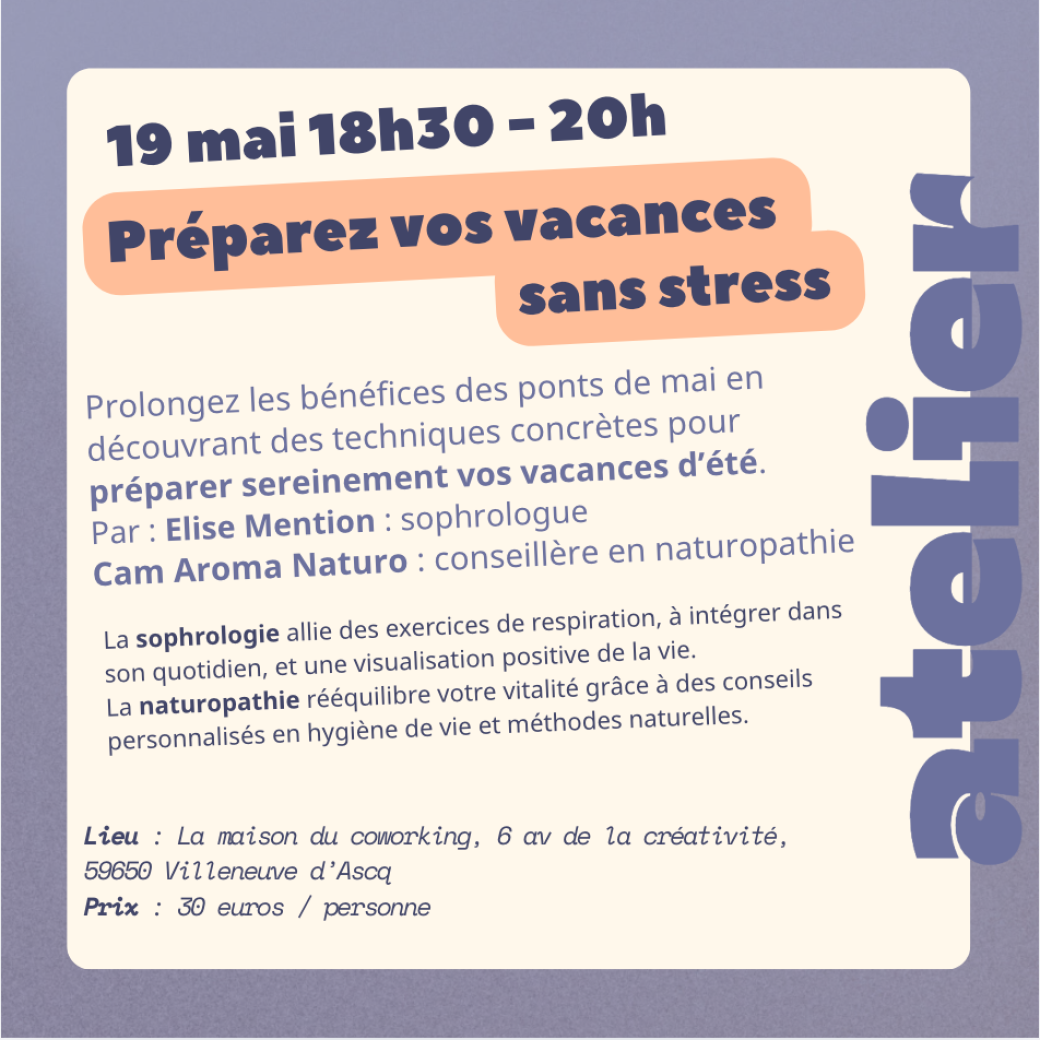 2026-05-19 18:30:002026-05-19 20:00:00Europe/ParisPréparez vos vacances sans stress - atelier sophrologie & naturopathieReservations on : https://www.billetweb.fr/preparez-vos-vacances-sans-stress-atelier-sophrologie-naturopathie