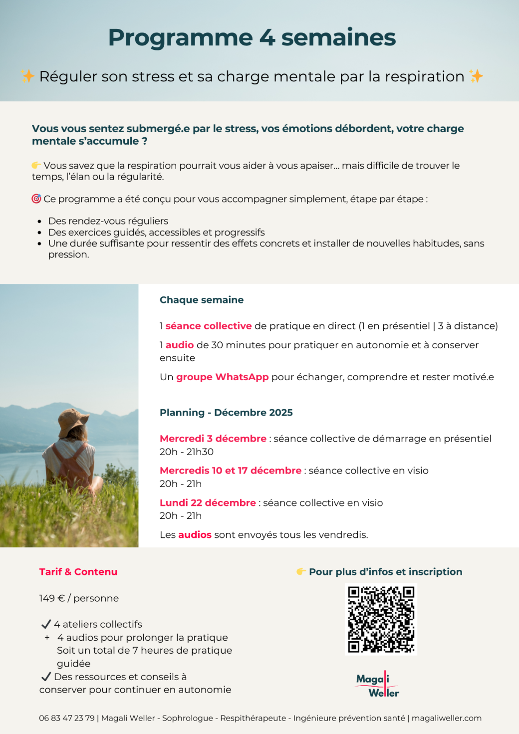 2025-12-01 00:00:002025-12-31 00:00:00Europe/ParisProgramme "Réguler son stress et sa charge mentale par la respiration"Reservations on : https://www.billetweb.fr/programme-reguler-son-stress-et-sa-charge-mentale-par-la-respiration