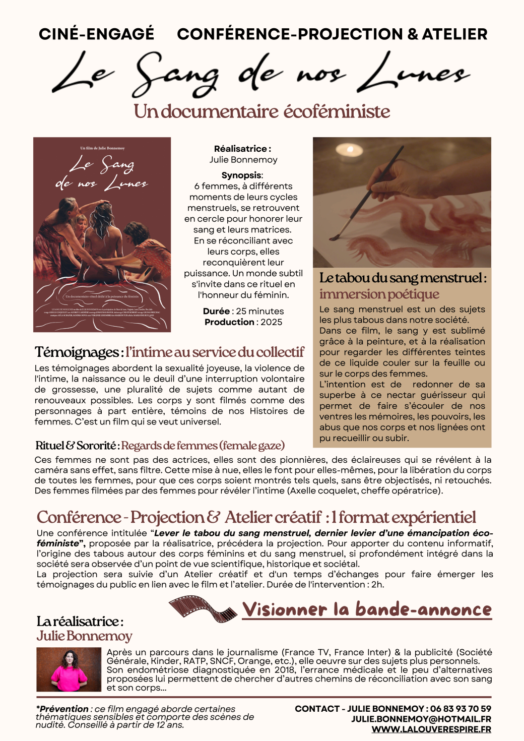 Le sang menstruel est un des sujets les plus tabous dans notre société. Dans ce film, le sang y est sublimé grâce à la peinture, et à la réalisation pour regarder les différentes teintes de ce liquide couler sur la feuille ou sur le corps des femmes. L’intention est de redonner de sa superbe à ce nectar guérisseur qui permet de faire s’écouler de nos ventres les mémoires, les pouvoirs, les abus que nos corps et nos lignées ont pu recueillir ou subir.