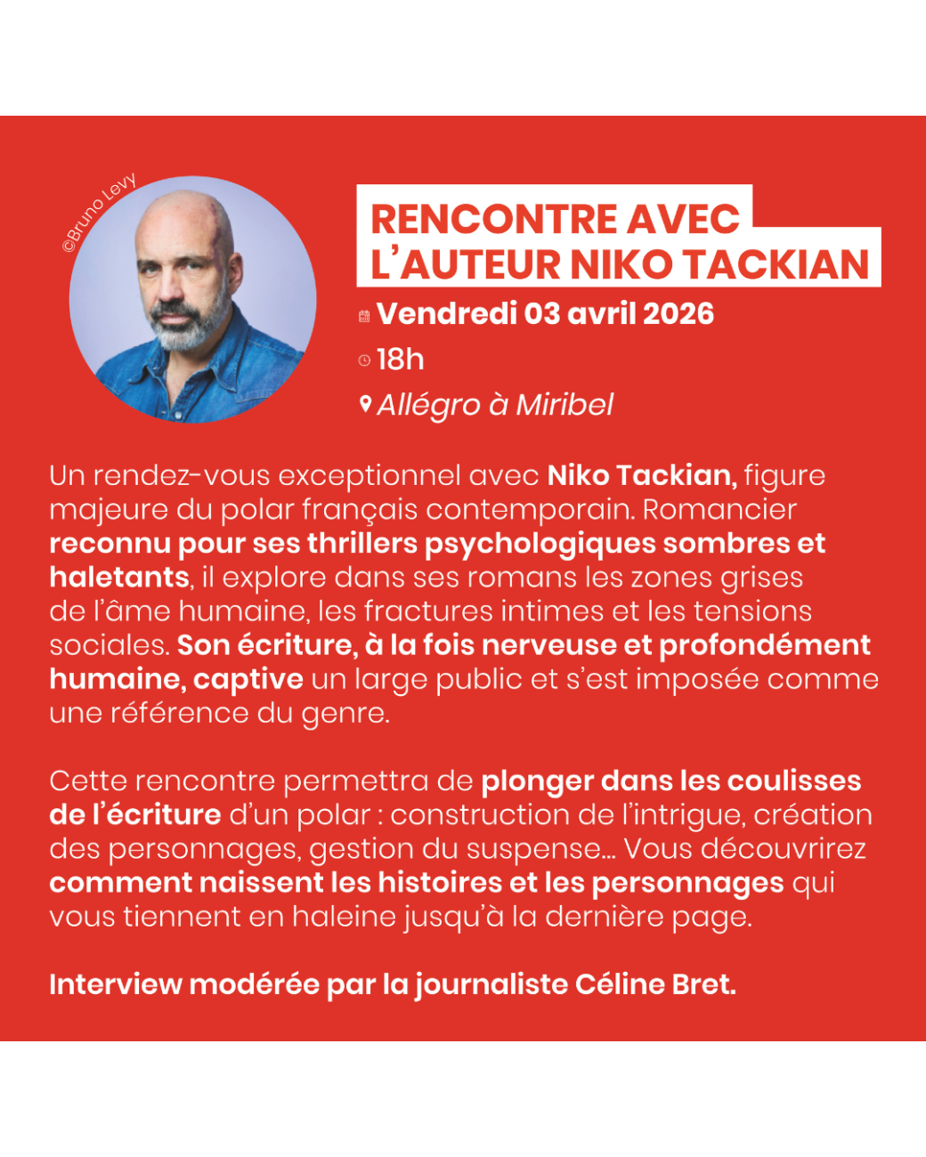 Un rendez-vous exceptionnel avec l’auteur Niko Tackian, figure majeure du polar français contemporain.