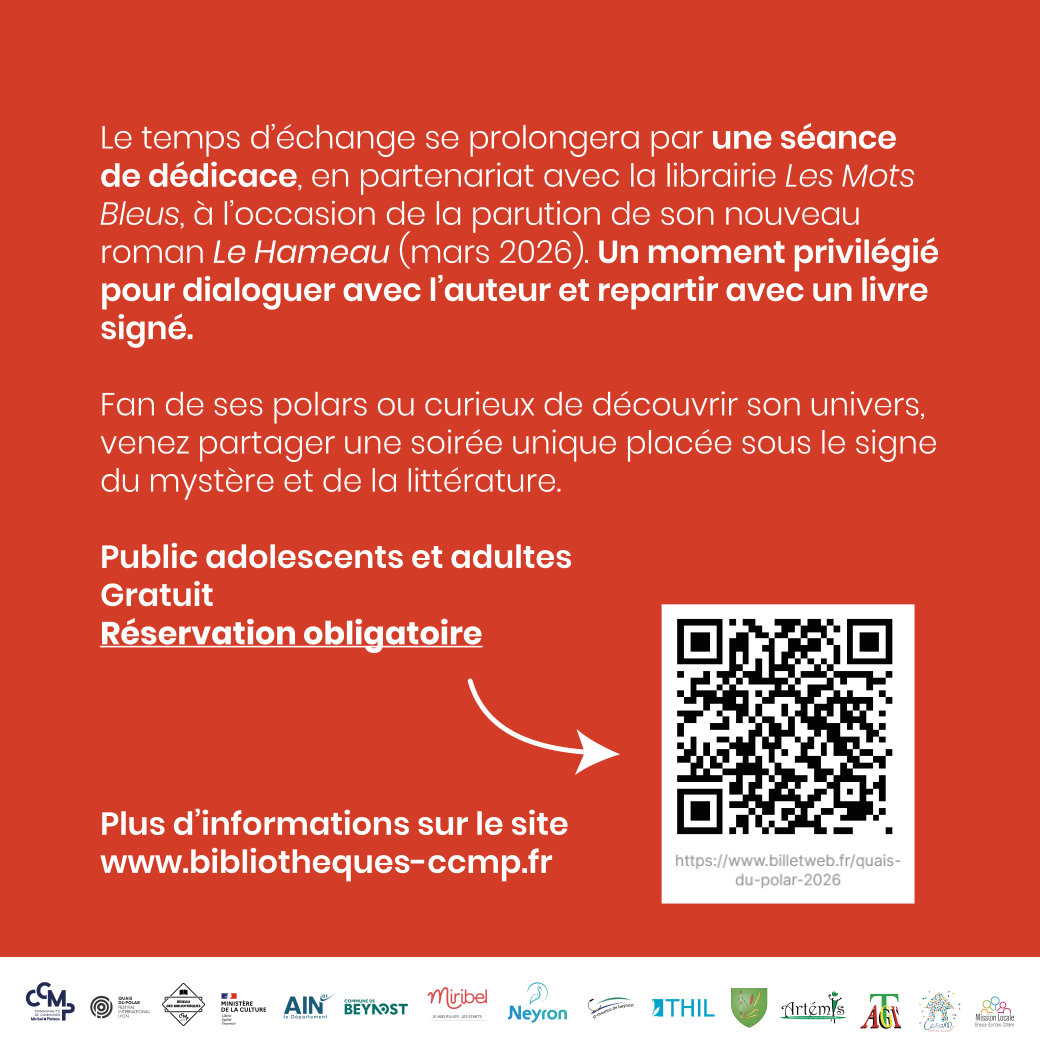 Le temps d’échange se poursuivra par une séance de dédicace, en partenariat avec la librairie Les Mots Bleus à l’occasion de la parution de son nouveau roman Le Hameau, prévue en mars 2026.