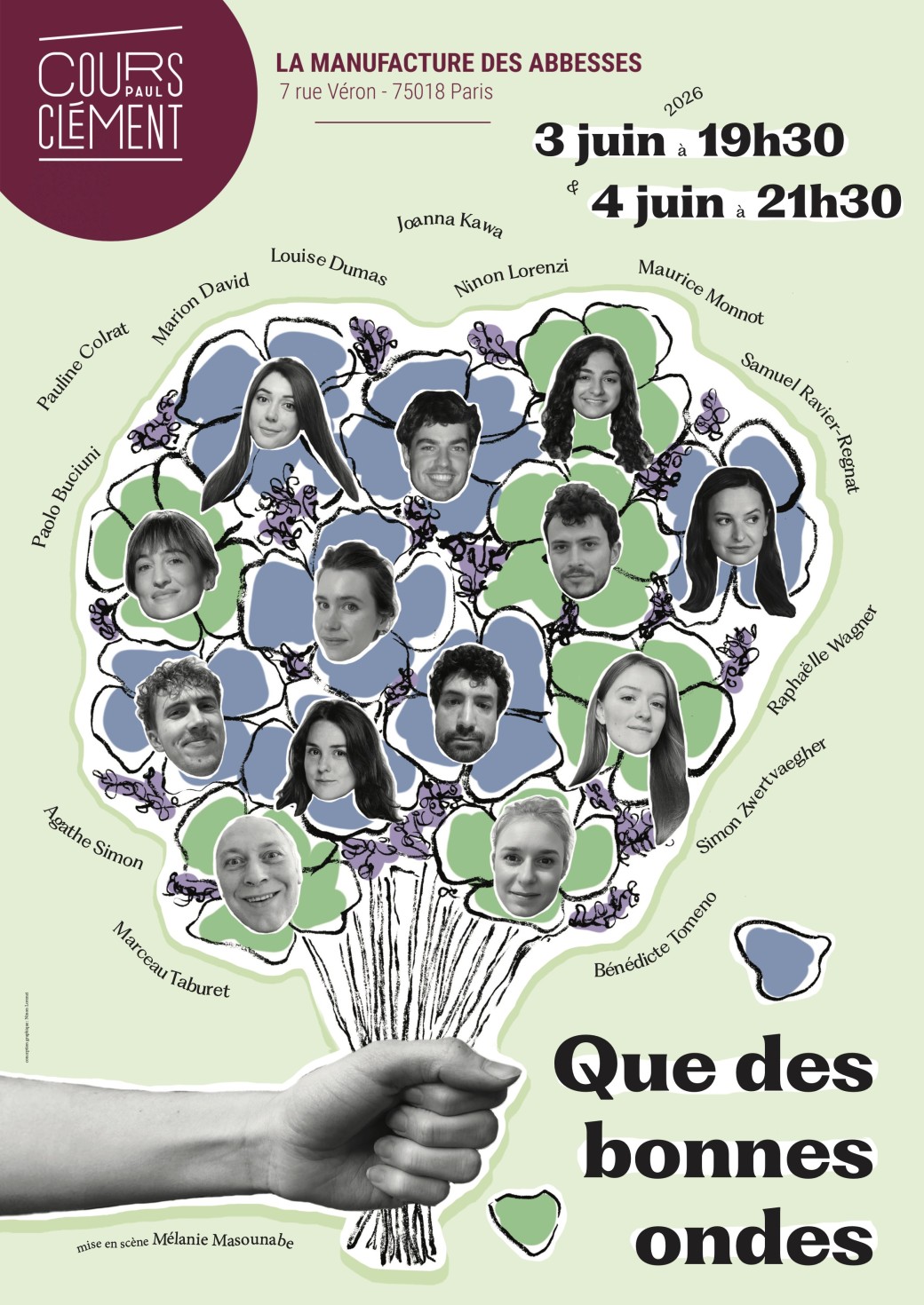 2026-06-03 19:30:00 2026-06-04 21:30:00 Europe/Paris Que des bonnes ondes Reservations on : https://www.billetweb.fr/que-des-bonnes-ondes -- Louis est un jeune avocat un peu effacé et peut être trop gentil, maladroit et en manque total de confiance en lui. Il travaille dans une cabinet où il passe largement inaperçu, autant professionnellement que socialement. Sa vie bascule le jour où, à la suite d’un malentendu, il pense être atteint d’un cancer. Pour la première fois, il devient le centre de l’attention : on l’écoute, on le soutient, on l’admire presque pour son supposé courage face à la maladie. Ce regard nouveau transforme peu à peu son quotidien… mais le mensonge prend de plus en plus d’ampleur. Mise en scène de Mélanie Masounabe Avec :  BERCHOUX MATTIONI Violaine - BESSE-CORFA Jeanne - BEURDELEY Auriane - BUCIUNI Paolo - CHADLY Audrey - CHLAPOWSKI Léa - DEBERT Allan - DIMENE Margaux - GAMOT Elsa - GILET Matthieu - KULKA Oscar - LERAY Vincent - SANTMARTY Tiphaine - TOMENO Bénédicte   Manufacture des Abbesses - 7 Rue Véron, 75018 Paris Cours Clément