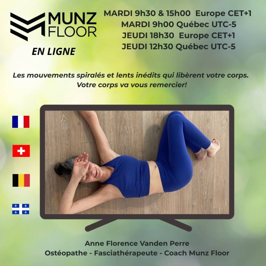 2026-02-02 18:00:00 2026-06-29 18:00:00 America/New_York Québec MUNZ FLOOR en ligne janvier - juin 2026 Reservations on : https://www.billetweb.fr/quebec-munz-floor-en-ligne-janvier-juin-2026 -- Saisisse Crée par Alexandre Munz, ancien danseur étoile, la méthode MUNZ FLOOR est composée de mouvements spiralés éxécutés dans une lenteur extrême, qui massent vos fascia en profondeur et renforcent les muscles profonds de la posture. Elle agit sur nos douleurs, raideurs et a également un effet anti-inflammatoire, assouplissante et réhydratante de nos tissus.  Plus d'infos sur https://anneflorencevandenperre.com/index.php/munz-floor/ Cette méthode s'apparente à une méditation en mouvement, exécutée uniquement au sol en utilisant le poids du corps. Elle s'adresse aussi bien aux sédentaires qu'aux sportifs et de l'adolescent à la personne âgée. Il n'y a pas de contre-indications, sauf la grossesse.    1 cours sont disponibles en présence, les  mercredis à 11h30 au Centre Pérou à Bruxelles 3 cours sont disponibles en ligne mes mardis à 9h30 et 15h et jeudi à 18h30, heure de Bruxelles-Paris-Genève   Envie d'en savoir plus? Appelez moi au 0495 52 47 61 (y compris WhatsApp) ou envoyez-moi… Québec, QC, Canada Anne Florence Vanden Perre