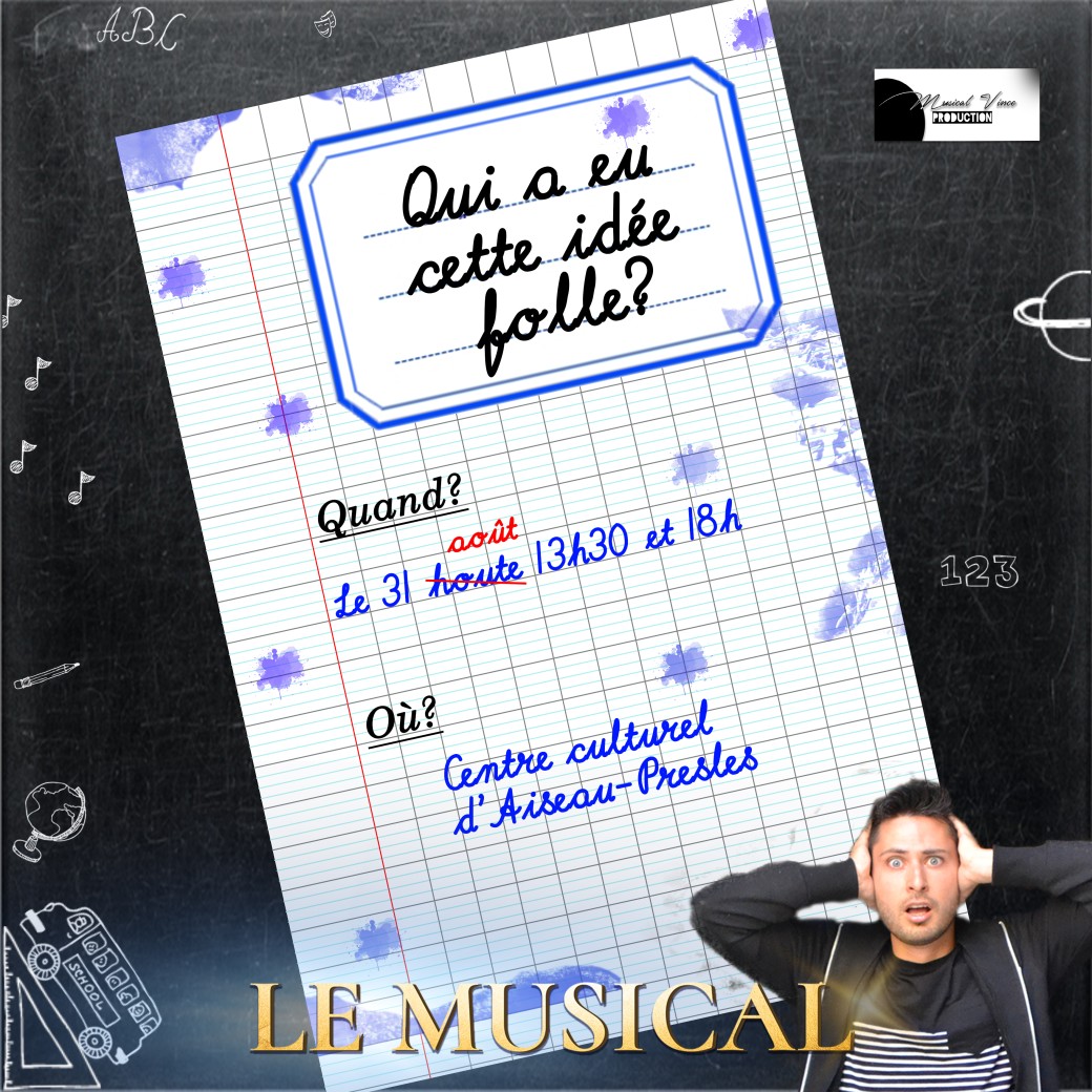Retrouvez tous vos souvenirs de classes, vos chagrins d'amour d'enfances, vos 400 coups...dans une comédie musicale : "Qui a eu cette idée folle"!