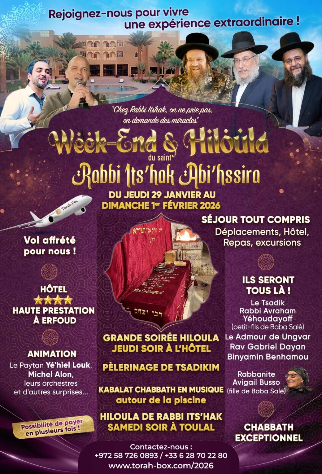 Voyage exceptionnel pour Hommes & Femmes dans un avion exclusivement affrété par Torah-Box… vers le saint et miraculeux Rabbi Its’hak Abi’hssira, au cœur du désert du Maroc.
