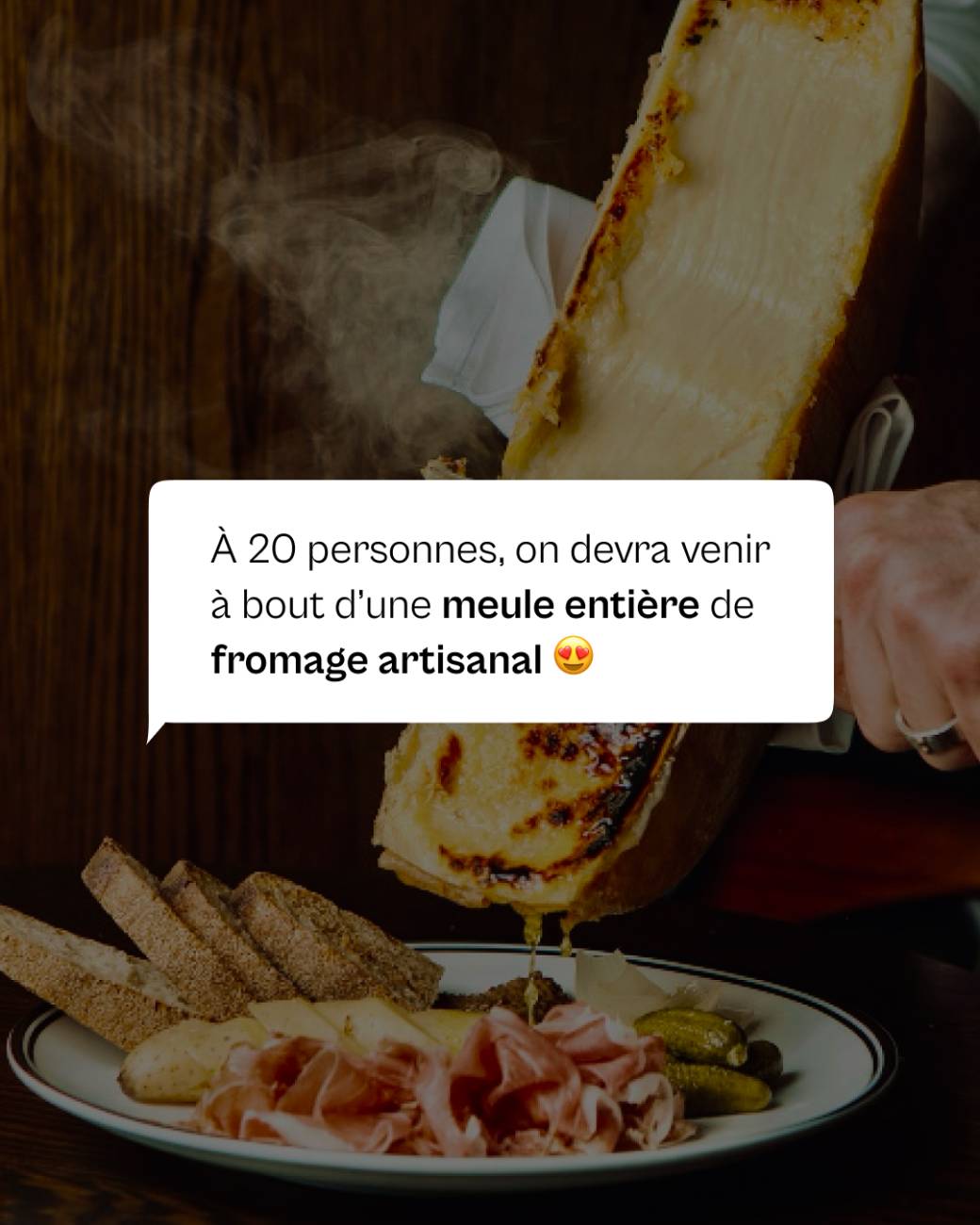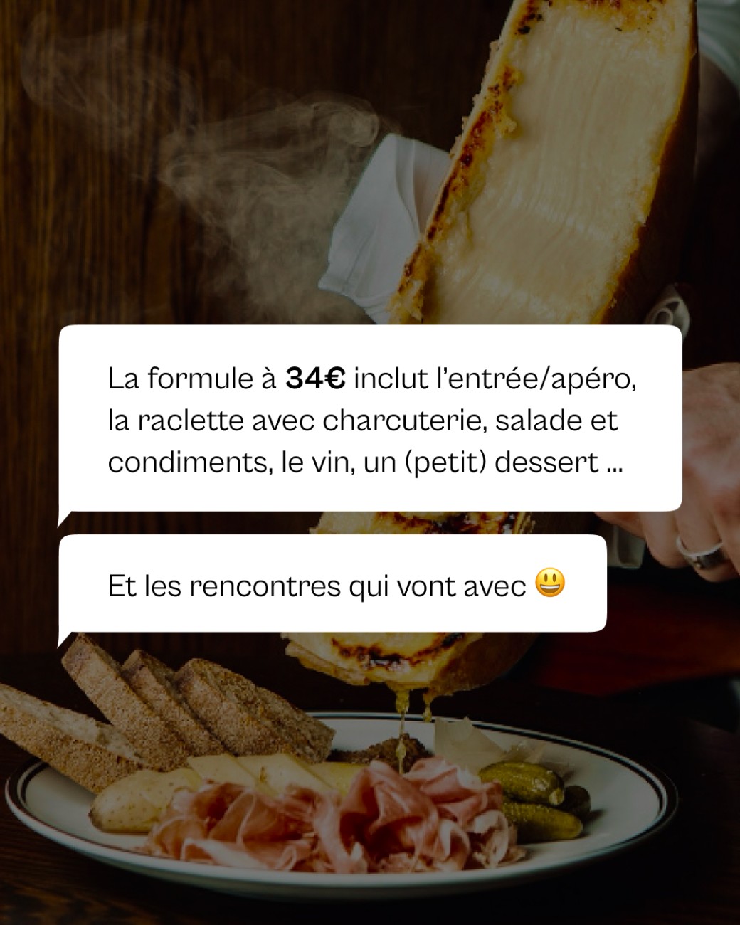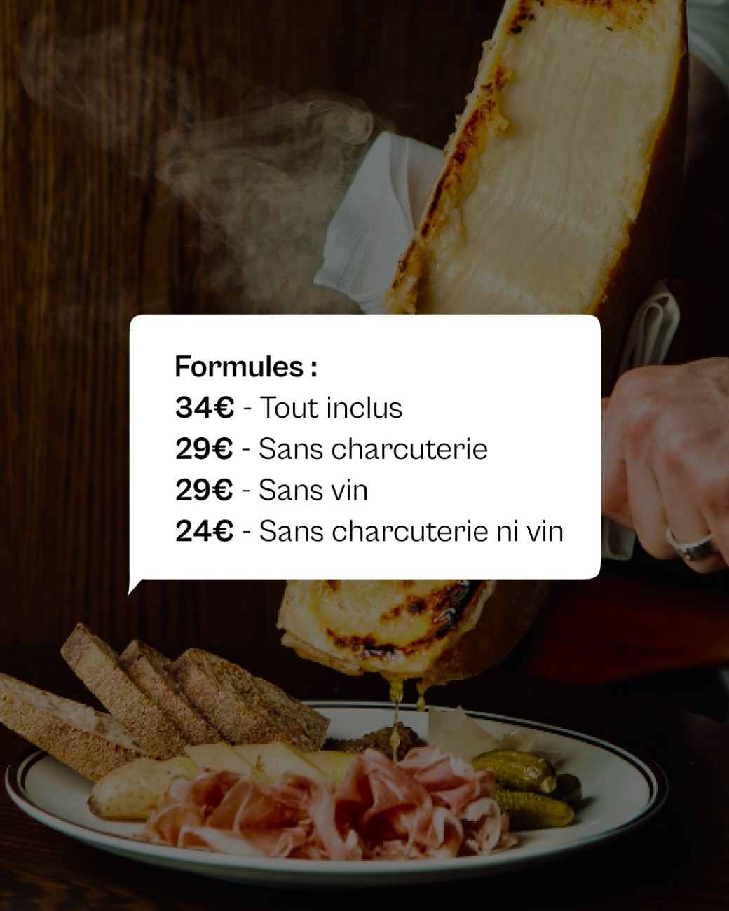 La formule à 34€ inclut tout le repas (apéro/entrée, raclette, charcuterie, dessert) avec au moins 2 verres de vin blanc de savoie ! Et c'est pas du fromage de supermarché, mais une vraie meule de fromage artisanale commandée directement de savoie ;)