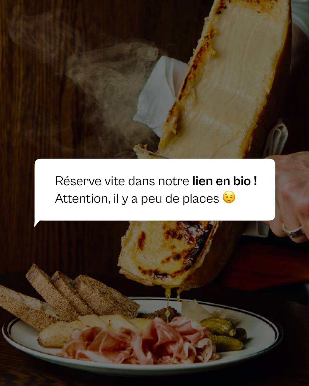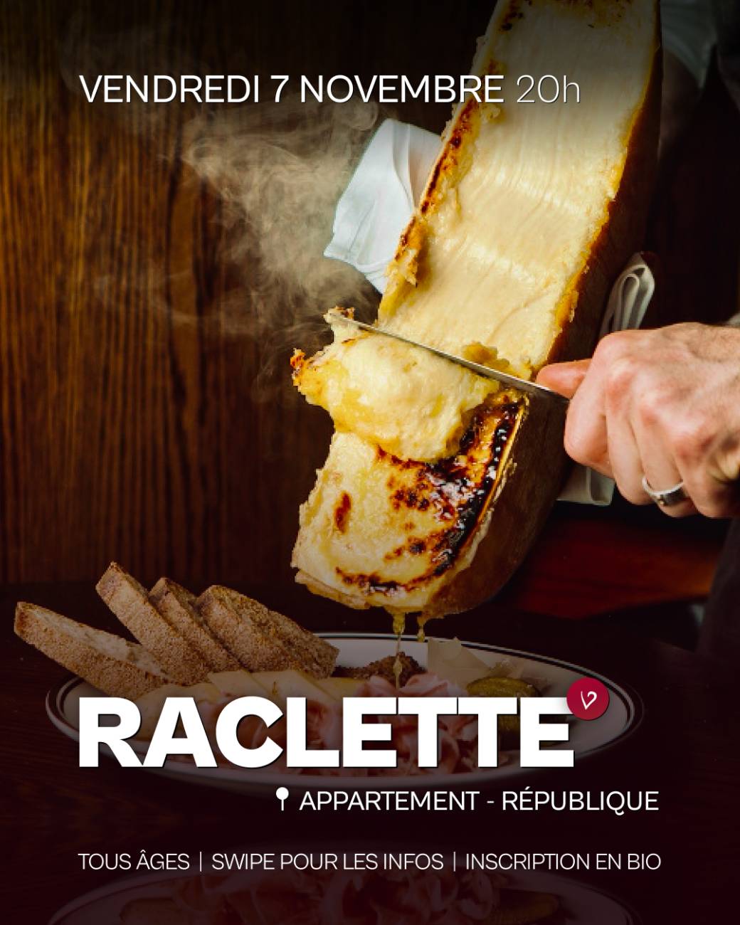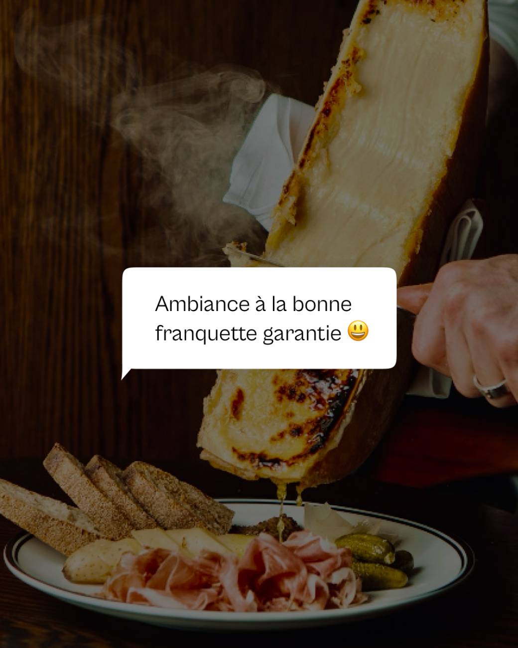 La formule à 34€ inclut tout le repas (apéro/entrée, raclette, charcuterie, dessert) avec au moins 2 verres de vin blanc de savoie ! Et c'est pas du fromage de supermarché, mais une vraie meule de fromage artisanale commandée directement de savoie ;)