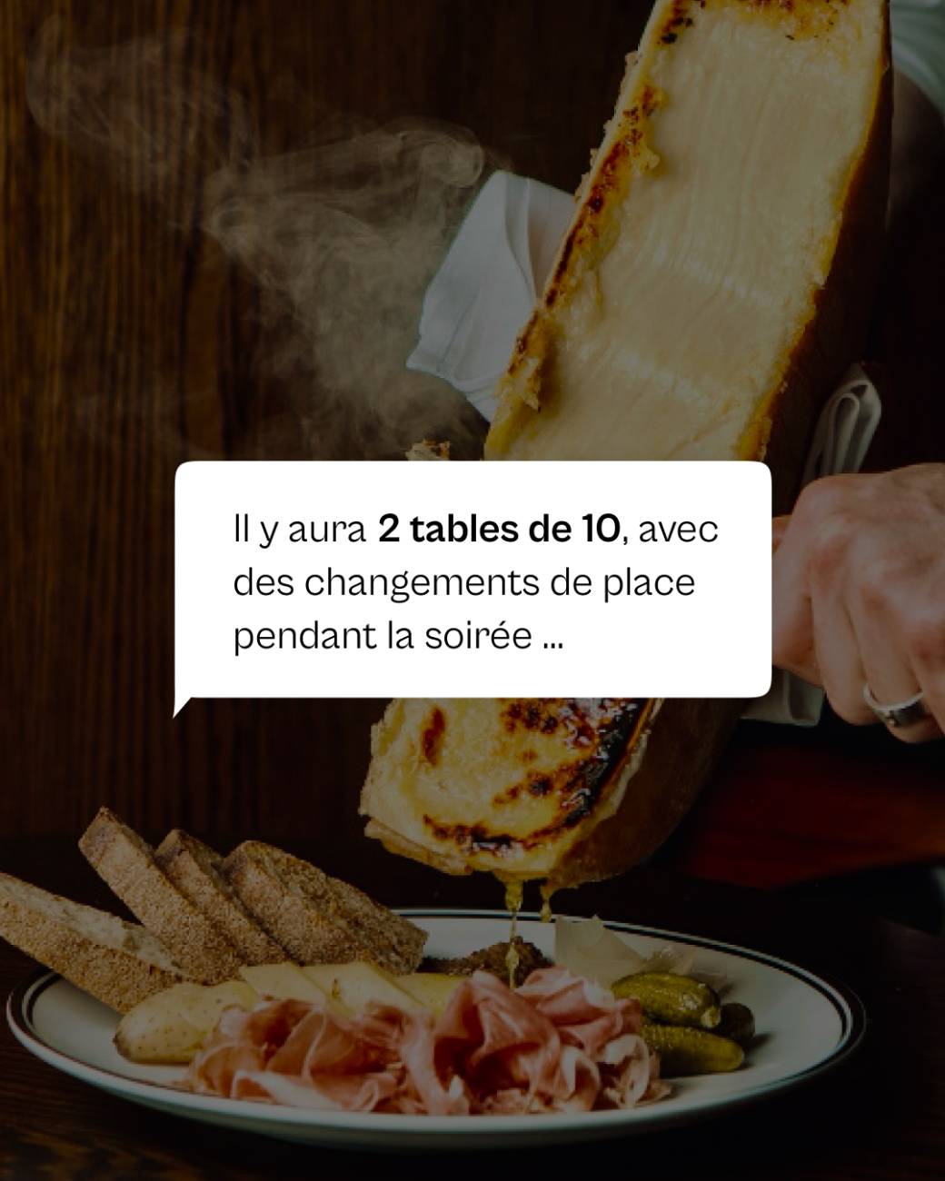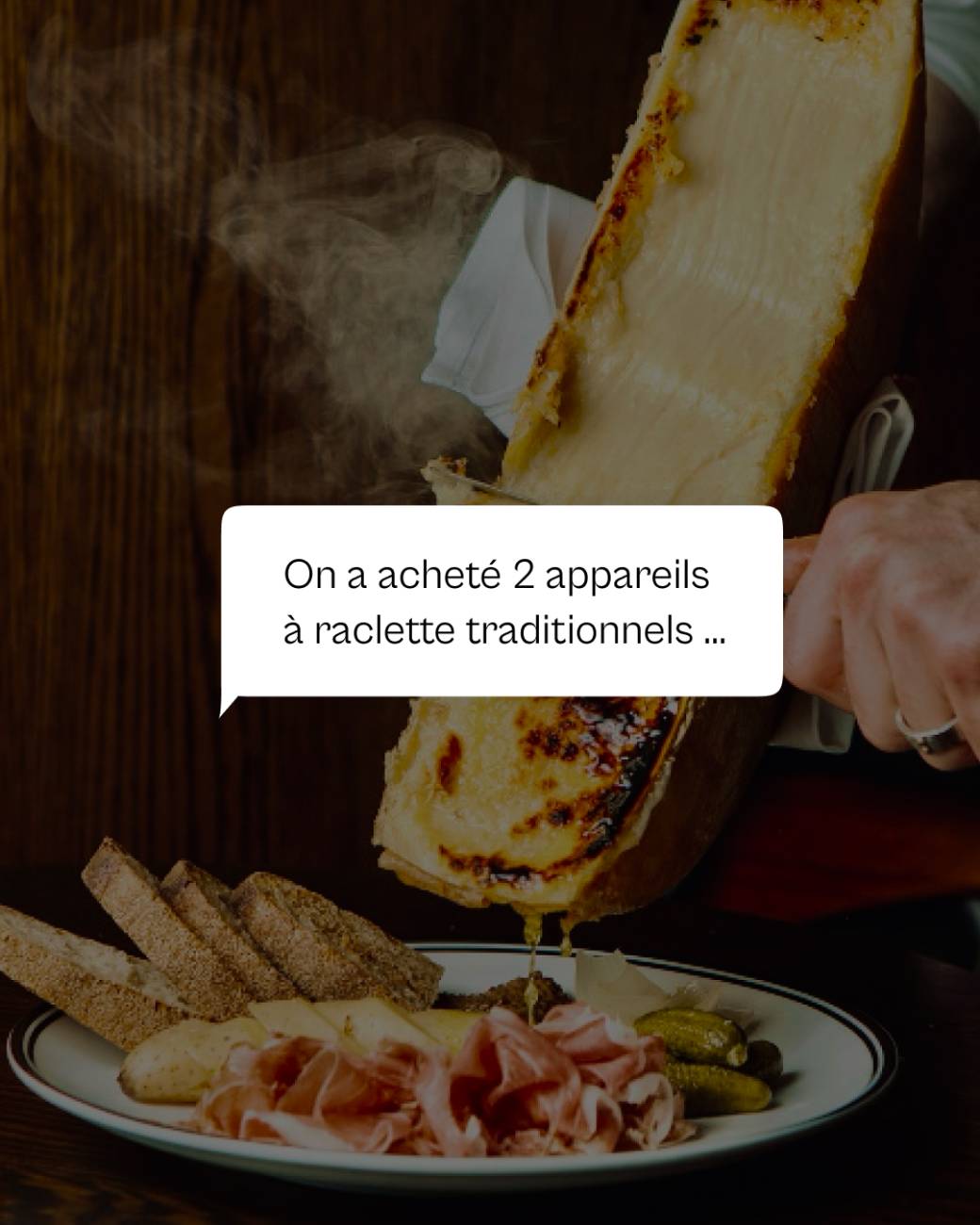 On sera installés à des tables de 10 à 12, autour de vrais appareils à raclette (pas les trucs avec les poêles, non, le vrai appareil avec la demi-meule dessus !)