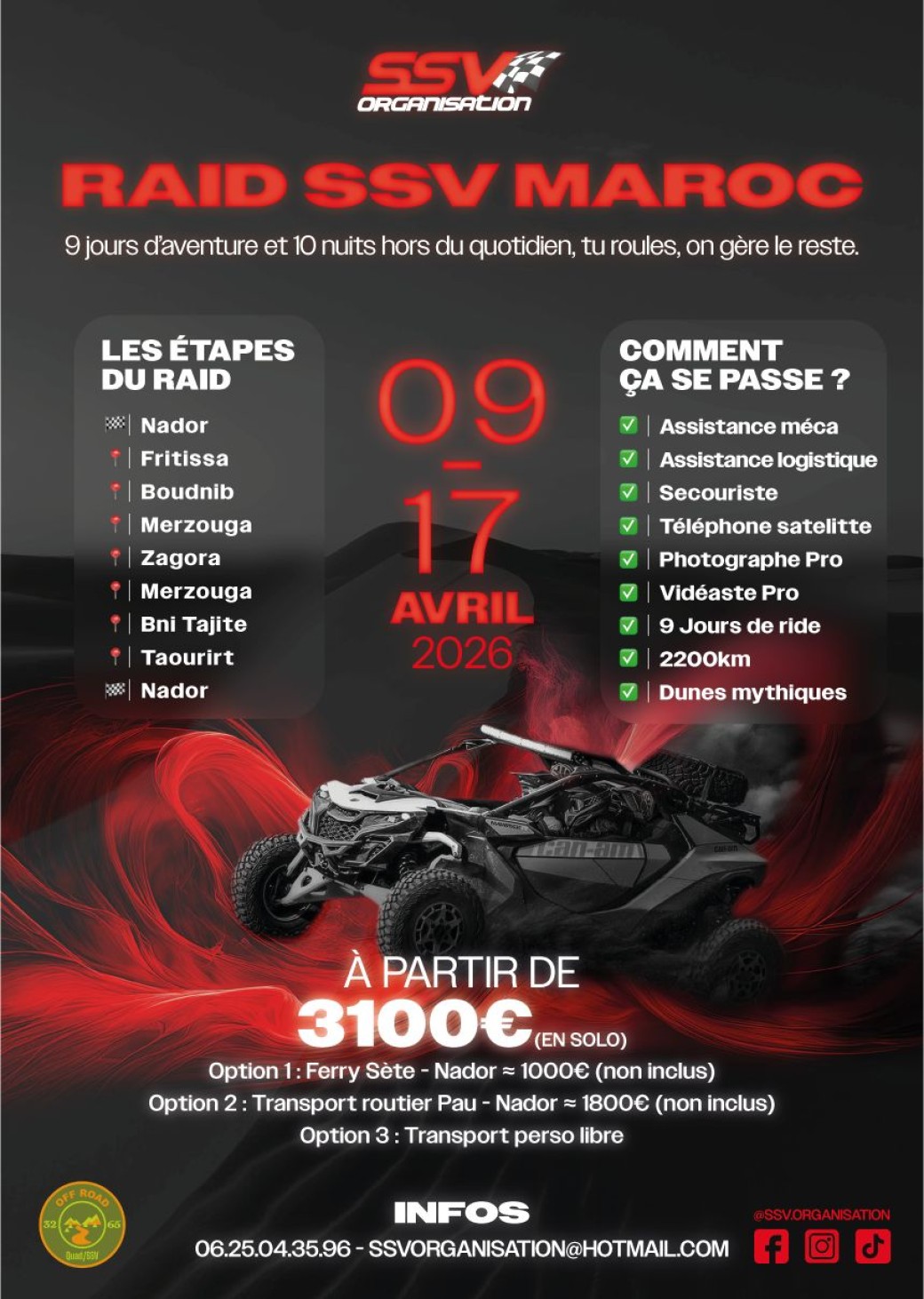SSV Organisation t’emmène sur les pistes mythiques du Maroc, entre désert, cols et dunes légendaires.