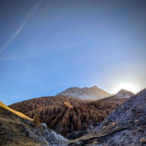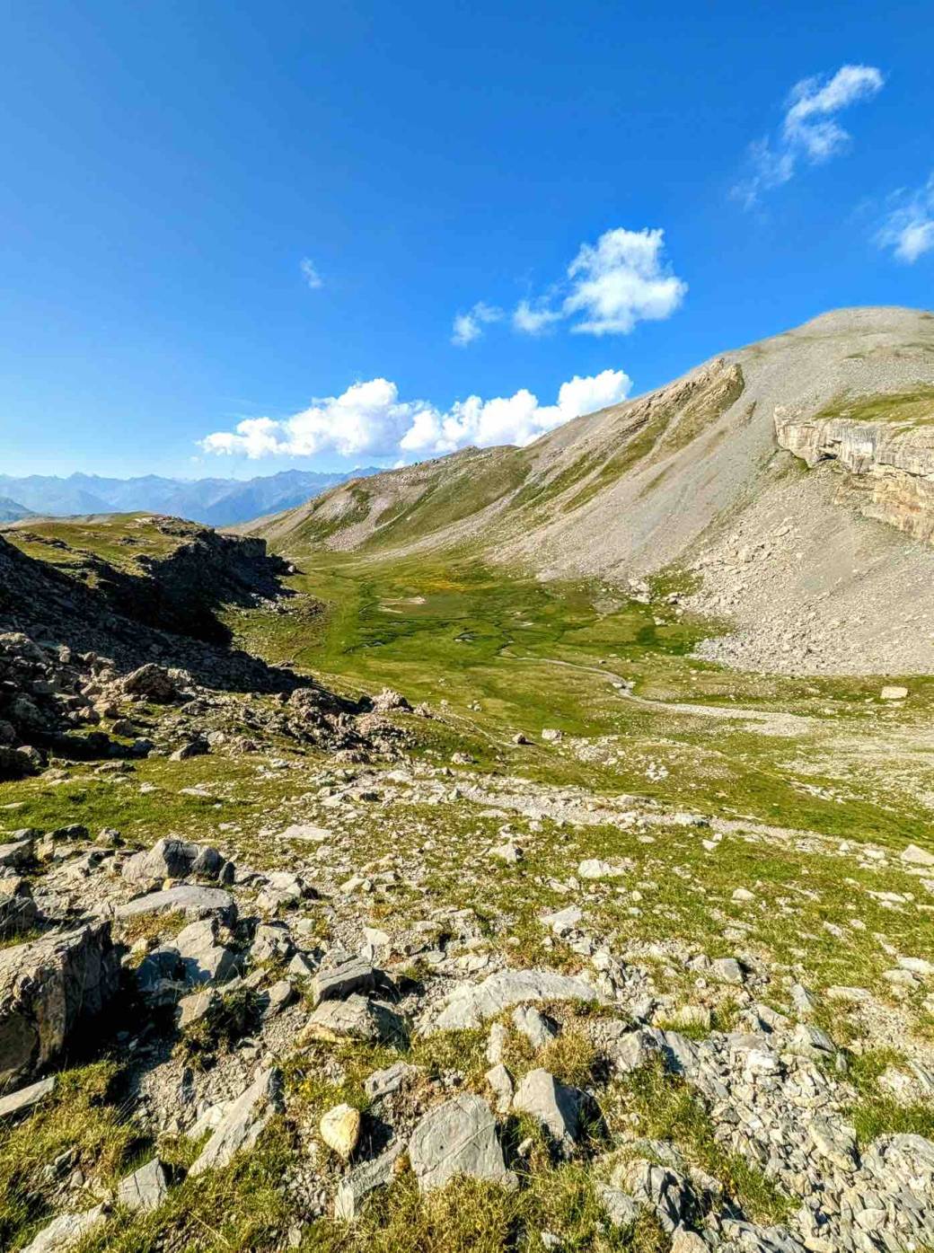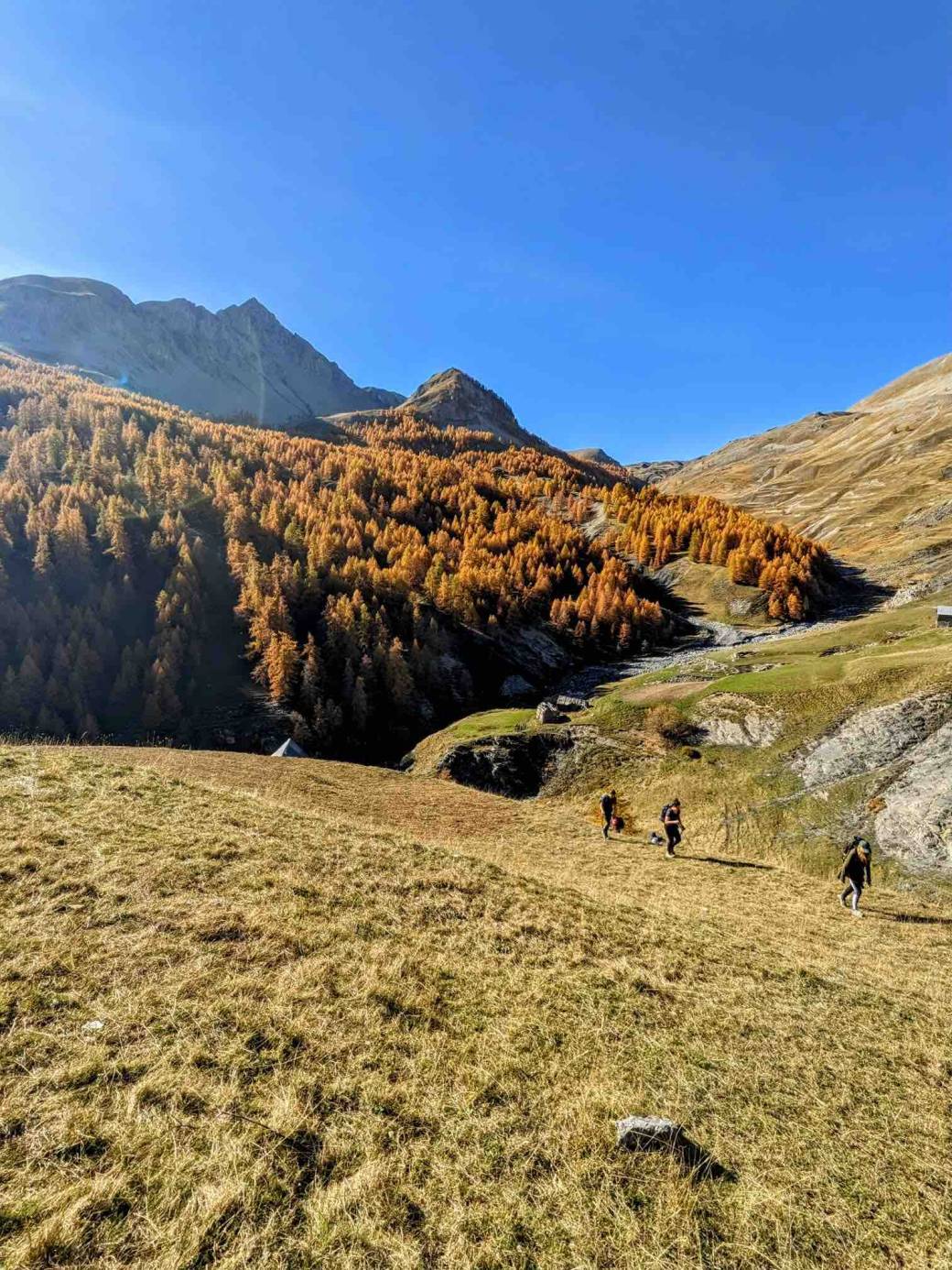 La descente se poursuit en douceur sur le GR5, offrant une vue plongeante sur les vallées et les paturages roussies par la saison. Le retour par le vallon de Salle Vieille complète cette boucle dans une atmosphère paisible, où il n’est pas rare de croiser des traces de la faune sauvage bien présente ici.