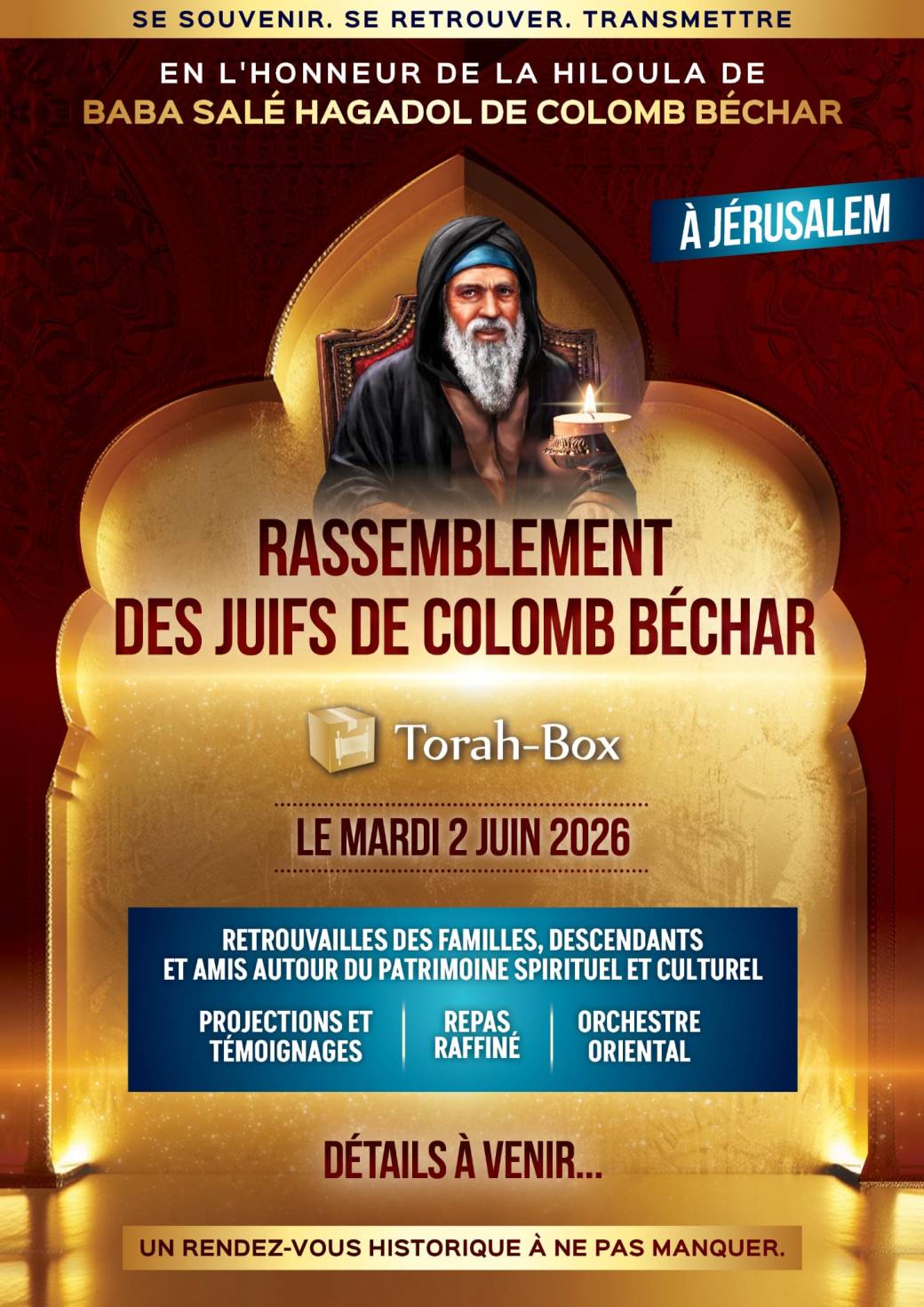 À l’occasion de la Hiloula de Baba Salé Hagadol de Colomb Béchar, Torah-Box organise un grand rassemblement des Juifs originaires de Colomb Béchar, ainsi que leurs familles, descendants et amis, pour un moment unique de mémoire, d’unité et de transmission.