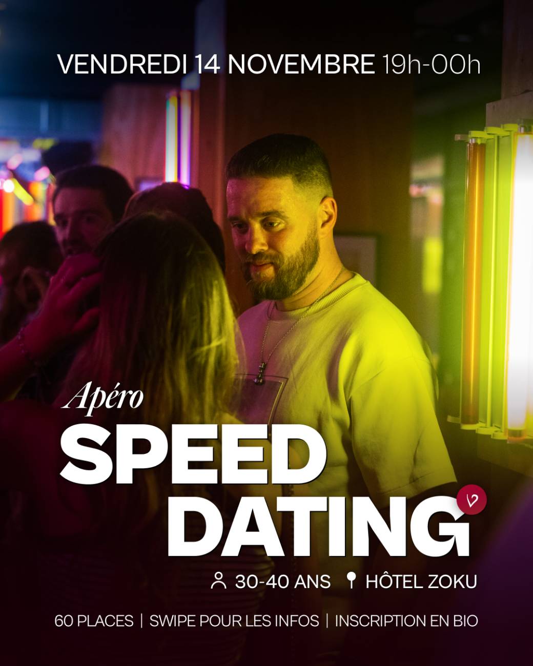 2025-11-14 19:00:002025-11-14 23:55:00Europe/ParisAPÉRO SPEED DATING 30-40 ANSReservations on : https://www.billetweb.fr/rdv-speed-dating-zoku
