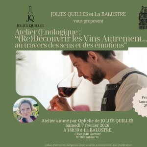 2026-02-07 18:30:00 2026-02-07 20:00:00 Europe/Paris (re)Découvrez les Vins Autrement, au travers des sens et des émotions par JOLIES QUILLES Reservations on : https://www.billetweb.fr/redecouvrez-les-vins-autrement-au-travers-des-sens-et-des-emotions -- La Balustre, Rue Jean Garnier, Tonnerre, France Ophélie