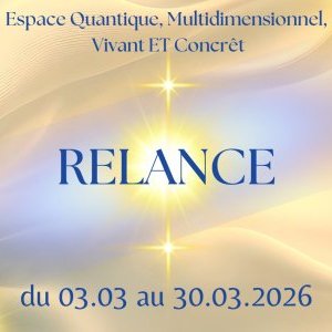 Les Codes de cet espace RELANCE c’est Conscience, Fusion Ether Matière, Multidimension, Quantique, Concret, Douceur, Bienveillance, Conscience, Ouverture de Coeur, Joie, légèreté, Fluidité, Amour, Responsabilité, Vérité, Prospérité