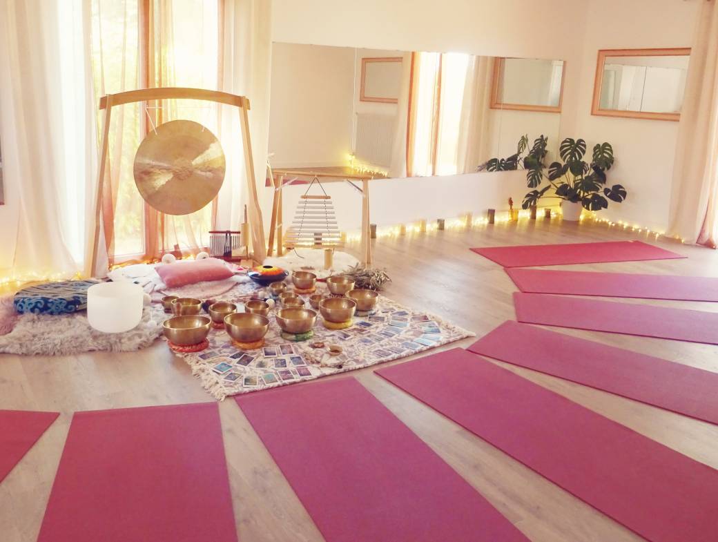 Dans le chaleureux studio de yoga Yogasunrise Poitiers, j'ouvre une bulle de détente et de relaxation apaisante grâce aux doux sons et aux vibrations profondes et enveloppantes des bols chantants