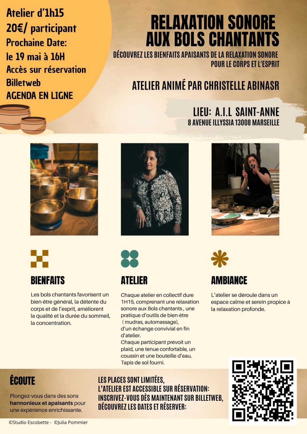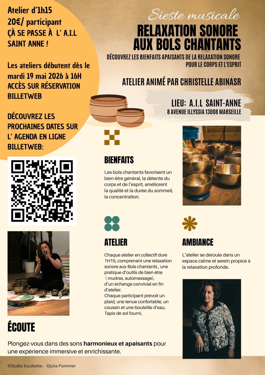 Elle vous propose aujourd’hui un atelier de relaxation tel un voyage sonore rythmé par les sons des bols chantants, carillons et autres percussions.