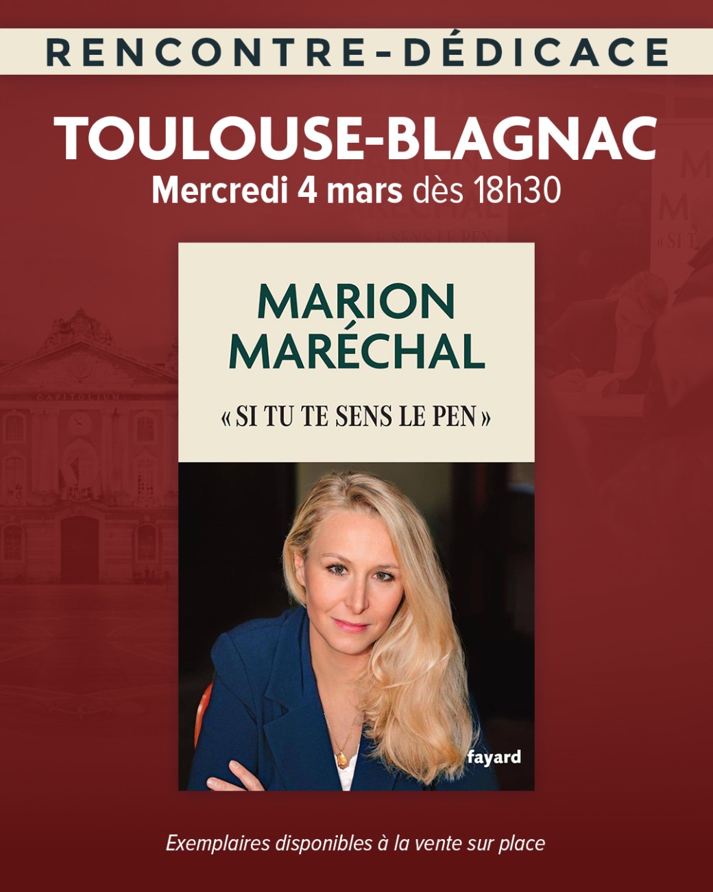 2026-03-04 18:30:002026-03-04 21:00:00Europe/ParisRencontre dédicace avec Marion Maréchal à ToulouseReservations on : https://www.billetweb.fr/rencontre-dedicace-avec-marion-marechal-a-toulouse
