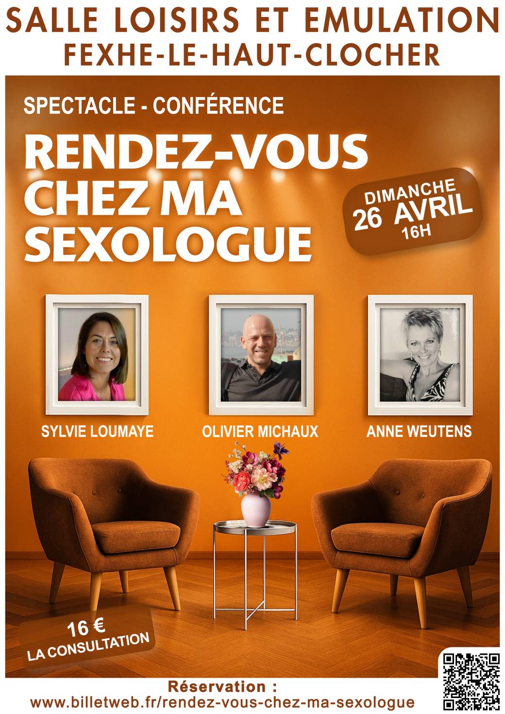 2026-04-26 16:00:00 2026-04-26 17:30:00 Europe/Paris Rendez-vous chez ma sexologue Reservations on : https://www.billetweb.fr/rendez-vous-avec-ma-sexuologue -- Bonjour    L OUVERTURE DES PORTES :  dès 15H où vous aurez l occasion éventuellement de boire un verre   avant l heure du spectacle de 16H  A TRES VITE    « Rendez-vous chez ma sexologue » est un spectacle-conférence tendre et mordant sur l’amour et la sexualité  ! Le public est placé au rebord de la fenêtre d’un vrai-faux cabinet de sexothérapie pour un moment joyeux, humain et sans fausse pudeur. La représentation hybride se compose de cinq saynètes, où des patients-personnages déposent leur histoire intime. Il y est question de désir, de tabous, de failles et d’élans intimes… Chaque « consultation » est suivie d’un petit temps de décryptage clair et accessible. Un aller-retour inédit entre le jeu et la réflexion, entre l’émotion et la compréhension. Distribution des rôles: - Sylvie Loumaye, psycho-sexologue et conférencière passionnée joue son propre rôle. - Anne Weutens, ambassadrice de produits intimes,  interprète avec une intensité bouleversante, des femmes en souffrance. - Oli… Salle Loisirs et Emulation Grand'Route 147, Fexhe-le-Haut-Clocher, Belgique Sylvie Loumaye