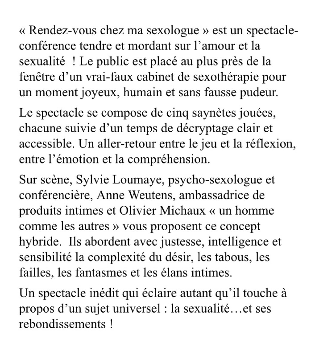 Reservations on : https://www.billetweb.fr/rendez-vous-chez-ma-sexologue --