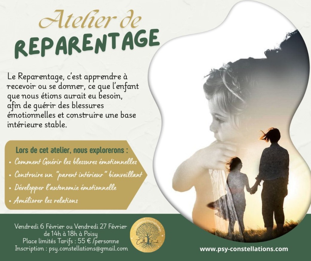 2026-02-27 14:00:00 2026-02-27 18:00:00 Europe/Paris Reparentage - Comment construire un parent intérieur bienveillant ? Reservations on : https://www.billetweb.fr/reparentage-comment-construire-un-parent-interieur-bienveillant1 --   Le reparentage, c’est apprendre à recevoir — ou se donner — ce que l’enfant que nous étions aurait eu besoin, afin de guérir des blessures émotionnelles et construire une base intérieure stable. Objectifs thérapeutiques: -Guérir les blessures émotionnelles : honte, peur de l’abandon, manque de confiance. -Construire un “parent intérieur” bienveillant : pour répondre aux besoins affectifs non satisfaits. -Développer l’autonomie émotionnelle : moins de dépendance aux autres pour se sentir en sécurité. -Améliorer les relations : on attire moins de relations toxiques une fois qu’on se sent soutenu intérieurement. Le reparentage, ou reparenting, est une approche thérapeutique profondément humaine qui invite chaque personne à revisiter les zones fragiles de son histoire, non pas pour les revivre, mais pour les réparer avec douceur, sécurité et compassion. Il s’agit d’un processus par lequel l’adulte d’aujourd’hui apprend à offrir à l’enfant qu’il a été les soins émotionnels qui lui ont ma… Poisy, France Psy-Constellations