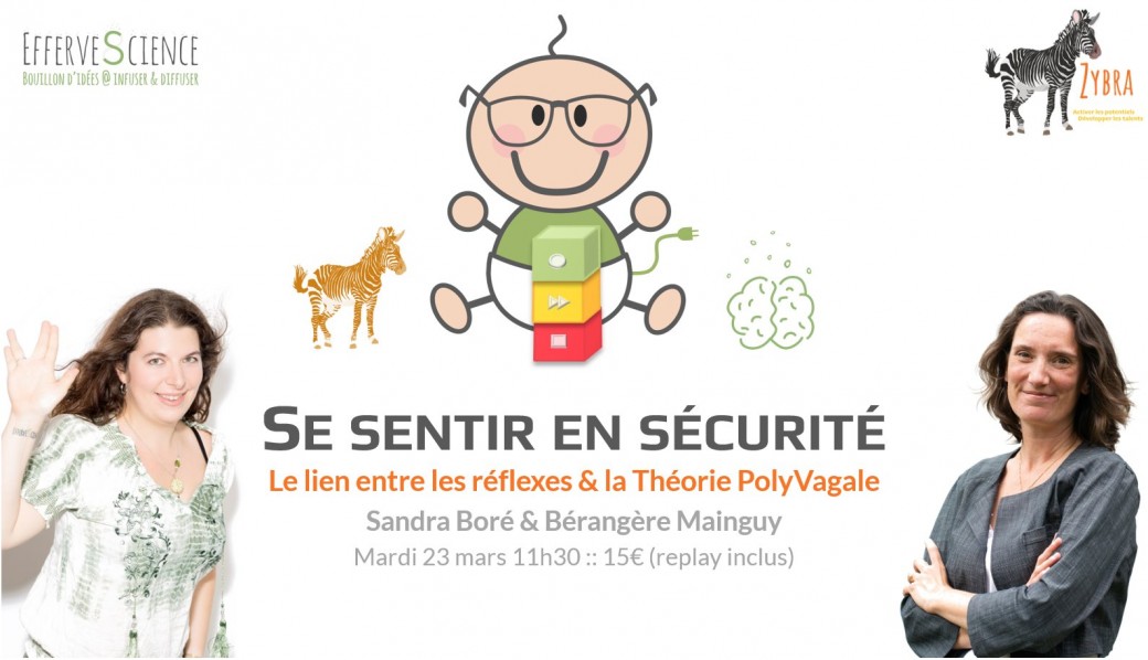 2021-03-24 10:00:00 2021-12-31 12:45:00 Europe/Paris Replay Se sentir en Sécurité - Le lien entre Réflexes Archaiques & Theorie Polyvagale Reservations on : https://www.billetweb.fr/replay-se-sentir-en-securite-le-lien-entre-reflexes-archaiques-theorie-polyvagale -- SE SENTIR EN SECURITE ....Le sentiment de Sécurité Intérieur se développe dès les premières semaines de la grossesse.Il va être soumis aux aléas de nos vies quotidiennes, de nos rencontres, de nos expériences et va se renforcer ou au contraire se fragiliser.Loin d'être une fatalité, il est possible de renforcer ce sentiment de sécurité en prenant soin de notre premier et principal allié : NOTRE CORPS !L'écouter, comprendre les signaux, l'apaiser, c'est possible.Nous vous apporterons des éclairages sur le Stress, la Theorie Polyvagale et les Réflexes Archaiques.Et, bien entendu, vous repartirez avec quelques astuces pour calmer votre système nerveux et maintenir ce calme.REPLAY DISPONIBLE JUSQU'AU 15 AVRIL 2021 - ZYBRA et EfferveScience