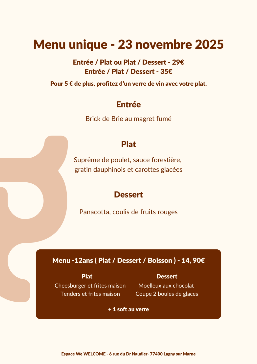 2025-11-23 12:45:002025-11-23 14:45:00Europe/ParisRéservation - Restaurant Les Planches de l'espace We Welcome - 23/11/2025Reservations on : https://www.billetweb.fr/reservation-restaurant-de-lespace-we-welcome-23-11-2025