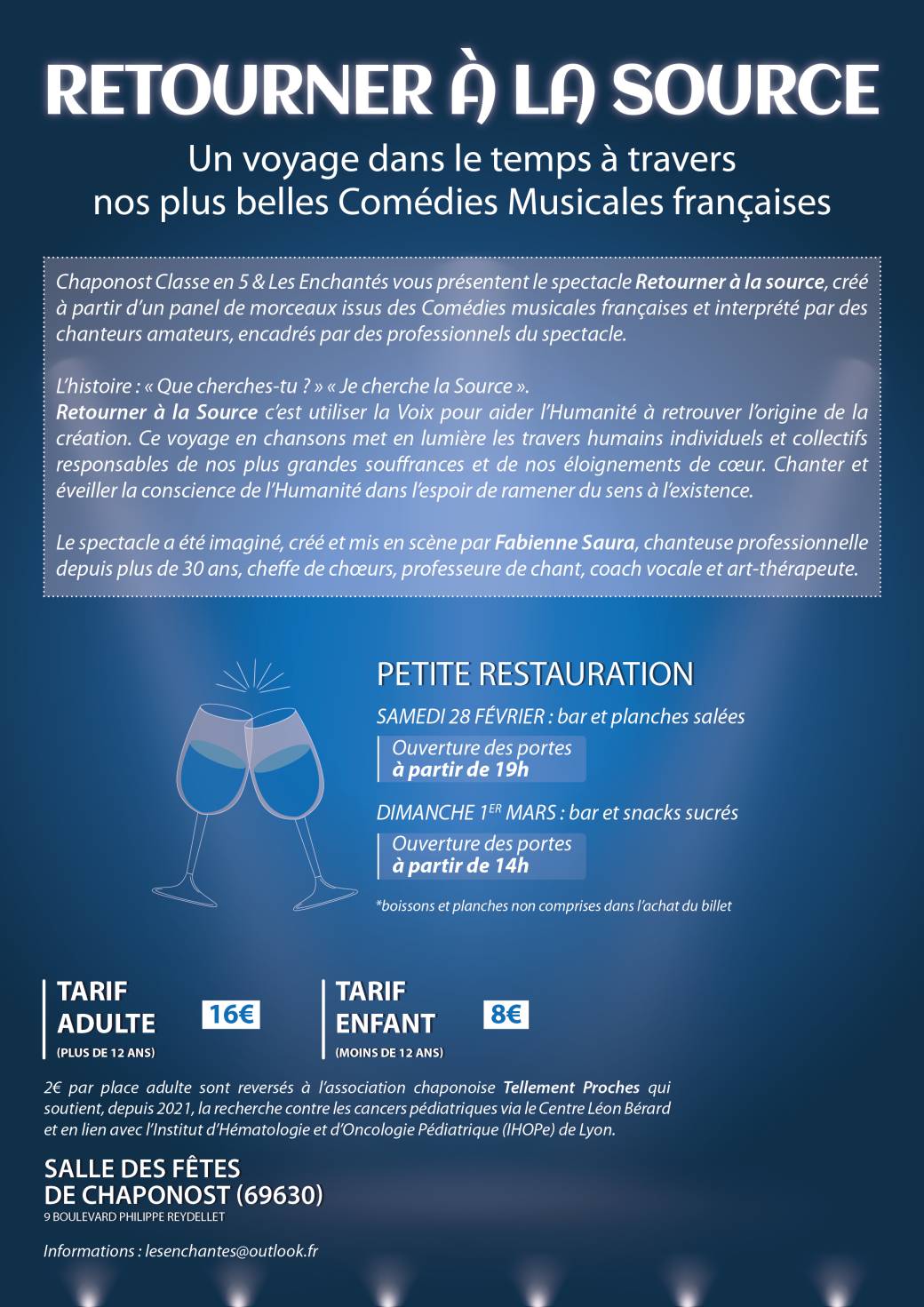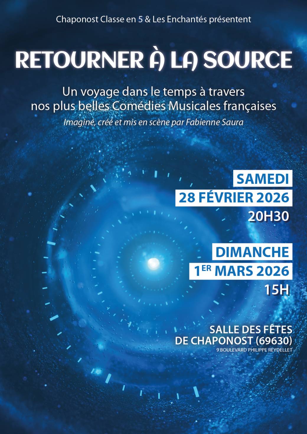 Chaponost Classe en 5 & Les Enchantés vous présentent le spectacle Retourner à la source, créé à partir d’un panel de morceaux issus des Comédies musicales françaises et interprété par des chanteurs amateurs, encadrés par des professionnels du spectacle.