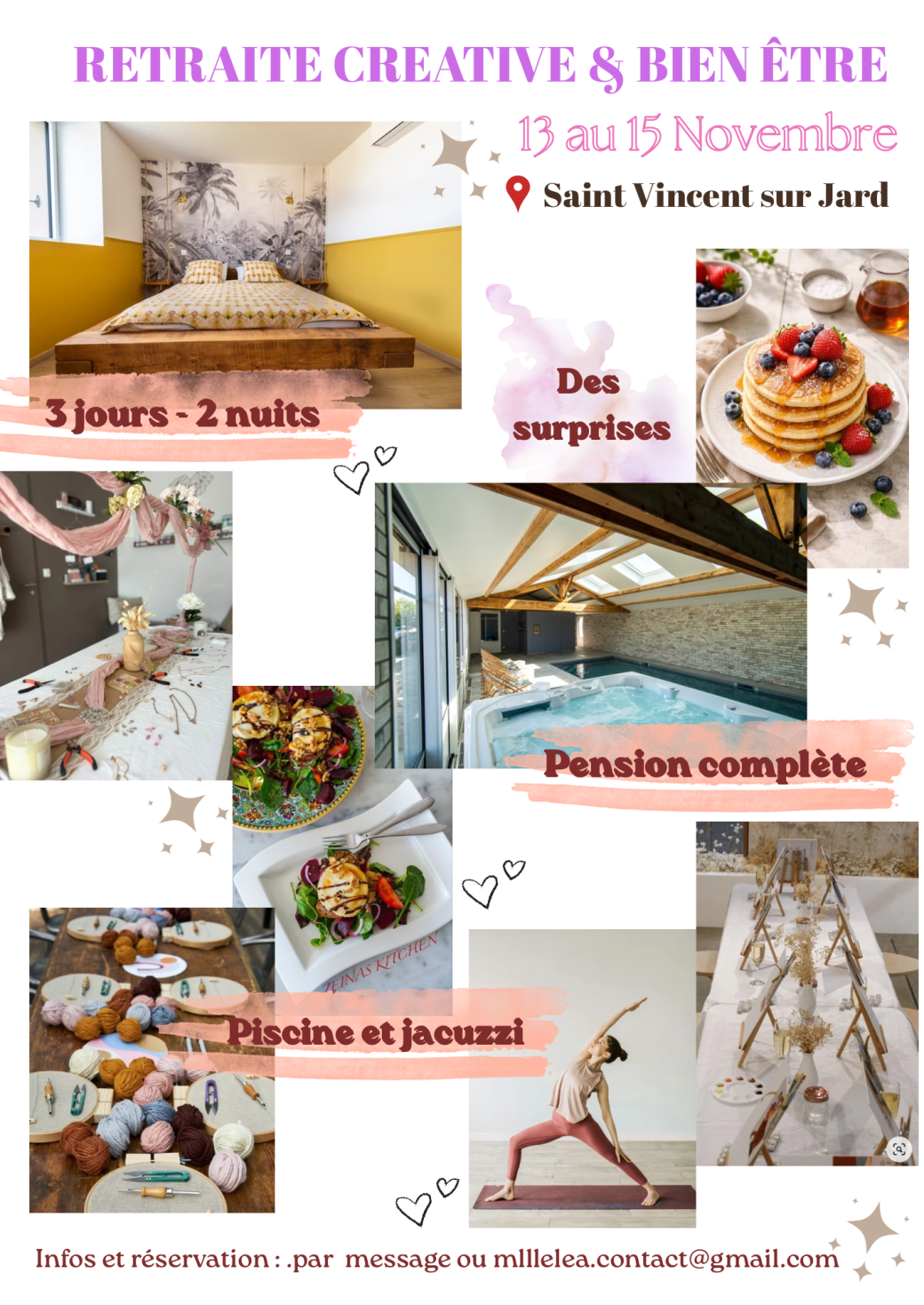 2026-11-13 17:30:00 2026-11-15 15:00:00 Europe/Paris Retraite créative & bien être Reservations on : https://www.billetweb.fr/retraite-creative-bien-etre1 -- Maison familiale et cocooning ????   Les retraites créatives sont imaginées comme des petits cocons qui permettent aux femmes de renouer avec leur créativité et de se retrouver ✨   Tu pars un week-end, tu te déconnecte et tu profites!   Exemples d'activités* :  peinture / yoga / macramé / aquarelle / journaling / création de bougies / crochet / broderie / pilâtes...   * liste non exhaustive - le programme est gardé secret jusqu'au jour J afin de faciliter l'effet de surprise et le lâcher -prise.     Infos pratiques :  • La retraite a lieu à Saint Vincent sur Jard (85)  Arrivée : Vendredi 13 novembre à partir de 17h30 - début de la retraite à 19h00 Départ : Dimanche 15 novembre à partir de 15h00   Inclus dans le prix : Hébergement 2 nuits / 2 jours Repas du vendredi soir au dimanche midi entièrement réalisés par nos soins et adaptés selon vos allergies/goût... Draps et serviettes de toilette Les ateliers créatifs/ bien être et activités du séjour   Non inclus : Le transport pour s… Saint-Vincent-sur-Jard, France Lea Delaporte