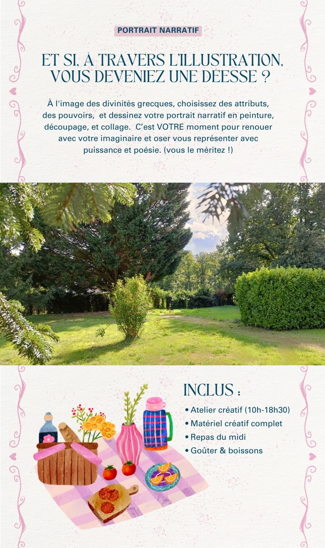 La retraite créative, c'est avant tout un moment pour VOUS, où votre bien-être redevient la priorité, et où la charge mentale est exclue. Soyez chouchoutée le temps d'une journée bucolique au jardin et laissez-vous guidée dans votre processus créatif.