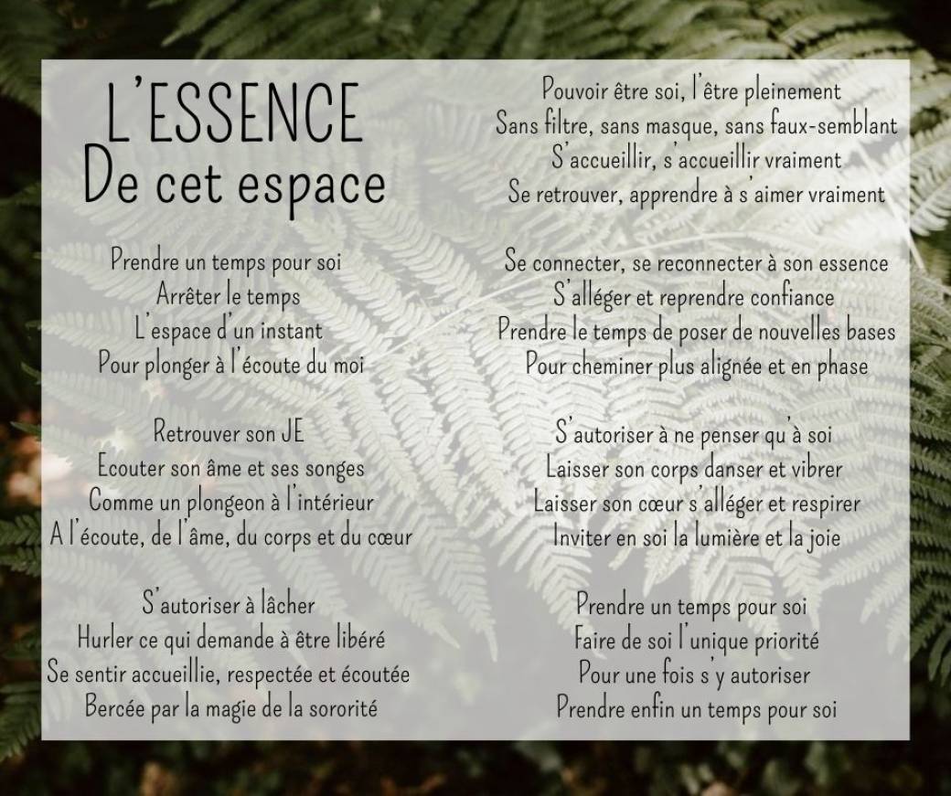 Si vous avez parfois l'impression d'être un peu coupée de vous-même, déconnectée, alors faites une pause, prenez un temps juste pour vous, autorisez-vous à vous offrir ce moment de bien-être. Cette parenthèse hors du temps se veut être une invitation à se recentrer intérieurement, à prendre le temps de s'écouter, à prendre soin de soi, tout simplement.