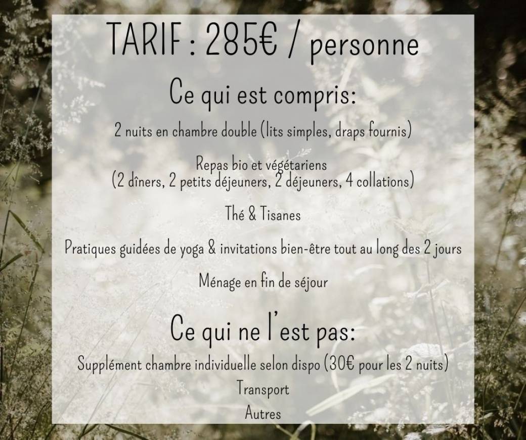 Ces deux nuits et deux jours se dérouleront dans un très beau lieu disposant d'une grande salle de pratique avec une vue nature magnifique. De belles balades sont possibles au départ du lieu. Côté hébergement : des chambres confortables avec des lits simples et linge de lit fournis. Une salle commune chaleureuse et conviviale nous accueillera sur les temps de pause, de partage et de repas (bio et de saison préparés avec amour).