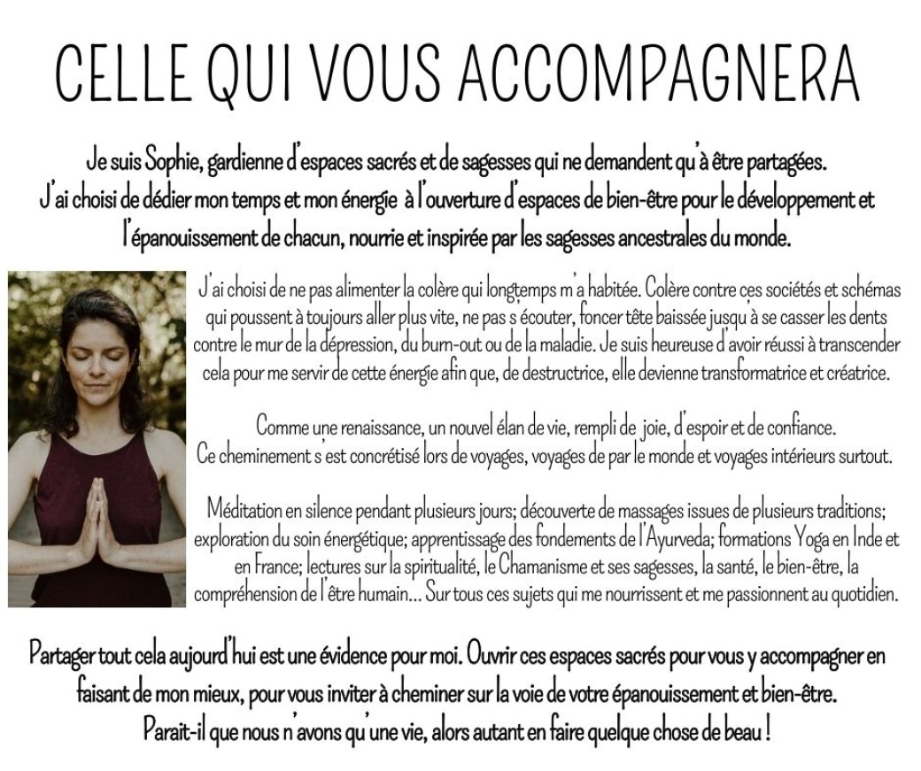 Cette retraite sera guidée par Sophie Duchamp, professeure de Yoga, thérapeute en Ayurveda et praticienne en soins et massages bien-être.