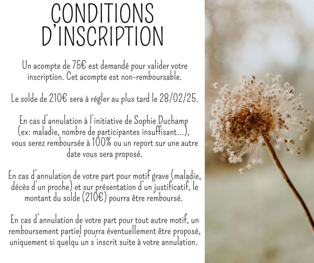En cas d’annulation à l’initiative de Sophie Duchamp (ex: maladie, nombre de participantes insuffisant...), vous serez remboursée à 100% ou un report sur une autre date vous sera proposé.