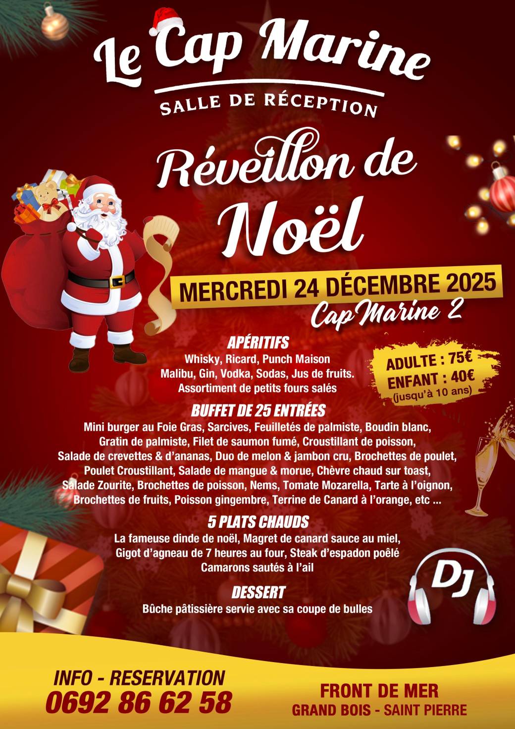 Venez célébrer la magie de Noël dans une ambiance festive et conviviale au Cap Marine 2 à Saint-Pierre, face à la mer.