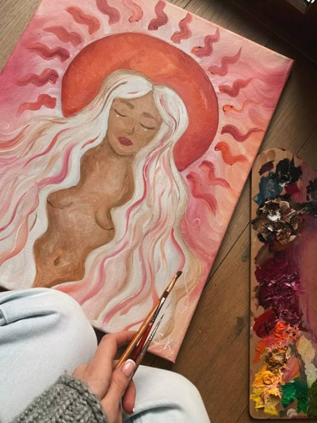 Next comes the heart of the workshop: a guided visualization where you’ll meet the younger version of yourself — the curious, playful, brave (or maybe fearful) little girl still inside of you. After the meditation, you’ll express that connection on canvas. You might paint silhouettes, shapes, symbols, colors — anything that represents your relationship.