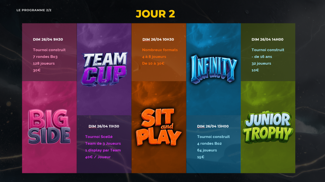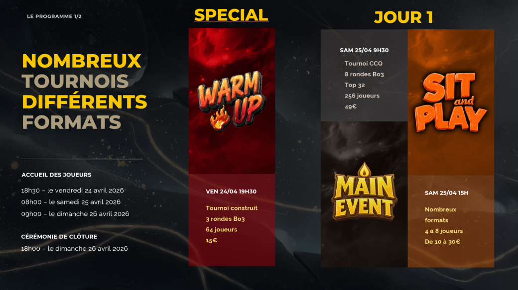 Nous réunissons les joueurs et les passionnés autour d’un événement soigné, immersif et rythmé par un programme dynamique.