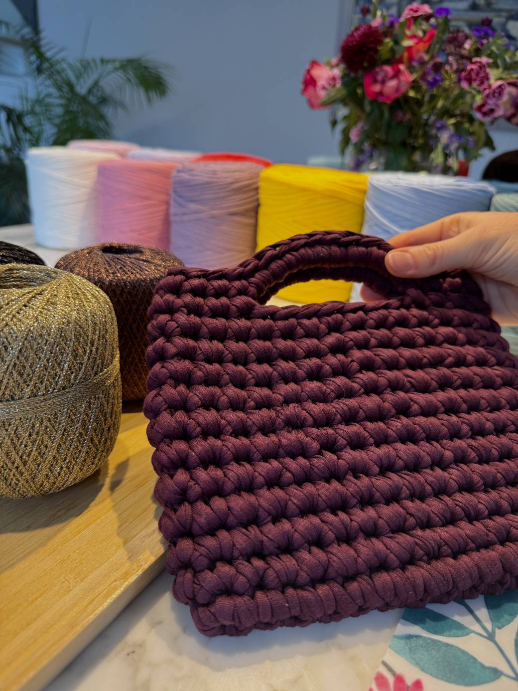 ✨ Au programme de cet atelier : tu vas apprendre à créer ton propre sac à main en crochet, à partir d’une maille de base accessible même si tu débutes ! Pas à pas, tu verras ton sac prendre forme entre tes mains, en fil t-shirt recyclé et dans la couleur que tu auras choisie. Le modèle est le même pour tout le monde afin de faciliter l’apprentissage, mais chaque sac devient unique grâce au choix des couleurs !