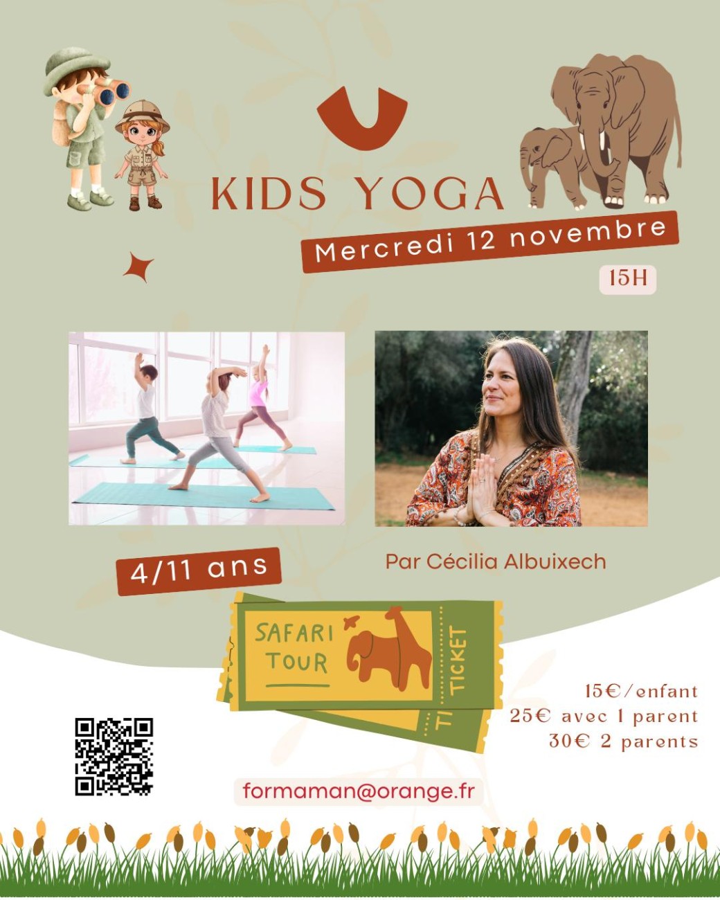Chaque séance a une thématique précise, selon la saison, l'énergie du moment, ou l'inspiration de Cécilia ! Ce jour-là le thème sera SAFARI YOGA pour partir à la rencontre des animaux de la SAVANE ;)
