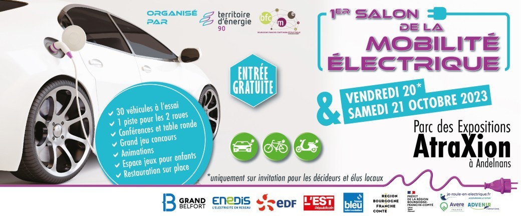 2023-10-20 10:00:00 2023-10-20 19:00:00 Europe/Paris 1er salon de la mobilité électrique Journée décideurs (élus, professionnels...) Reservations on : https://www.bfcme-asso.fr/rencontres-de-la-mobilite-electrique -- Pour plus d'informations sur le programme de cet événement, consultez notre site internet : www.bfcme-asso.fr (rubrique 1er salon de la M.E/Belfort). L' AtraXion - Parc des expositions, 23 rue des Prés, 90400 Andelnans, France BFCME et Territoire d'Energie 90
