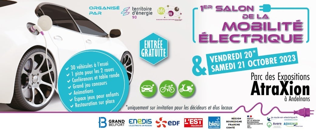 2023-10-21 10:00:00 2023-10-21 19:00:00 Europe/Paris 1er Salon de la Mobilité Electrique Journée grand public Reservations on : https://www.bfcme-asso.fr/rencontres-de-la-mobilite-electrique -- Pour plus d'informations sur le programme de cet événement, consultez notre site internet : www.bfcme-asso.fr (rubrique 1er salon de la M.E/Belfort). L' AtraXion - Parc des expositions, 23 rue des Prés, 90400 Andelnans, France BFCME et Territoire d'Energie 90