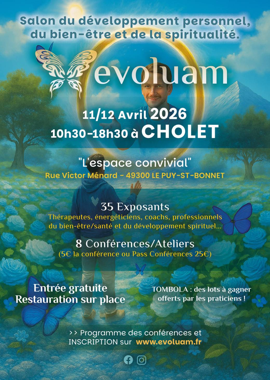 EVOLUAM met en lumière une grande variété de praticiens en développement personnel, bien-être, spiritualité pour accompagner le grand public dans son évolution personnelle. Les salons ont lieu majoritairement dans l'Ouest de la France.